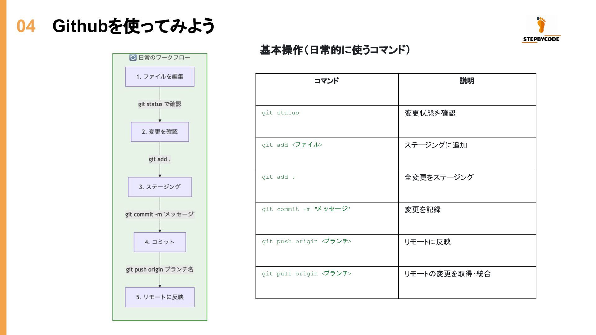 04 Githubを使ってみよう コマンド 説明 git status 変更状態を確認 git add <ファイル>
