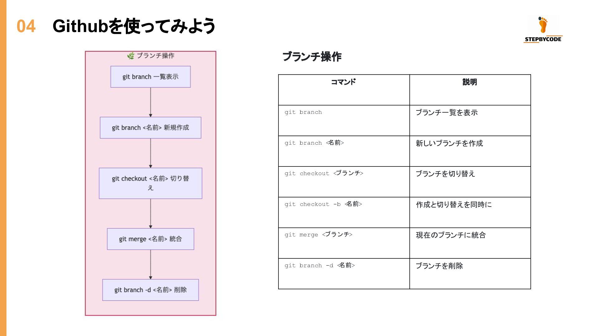 04 Githubを使ってみよう コマンド 説明 git branch ブランチ一覧を表示 git branch <名前>