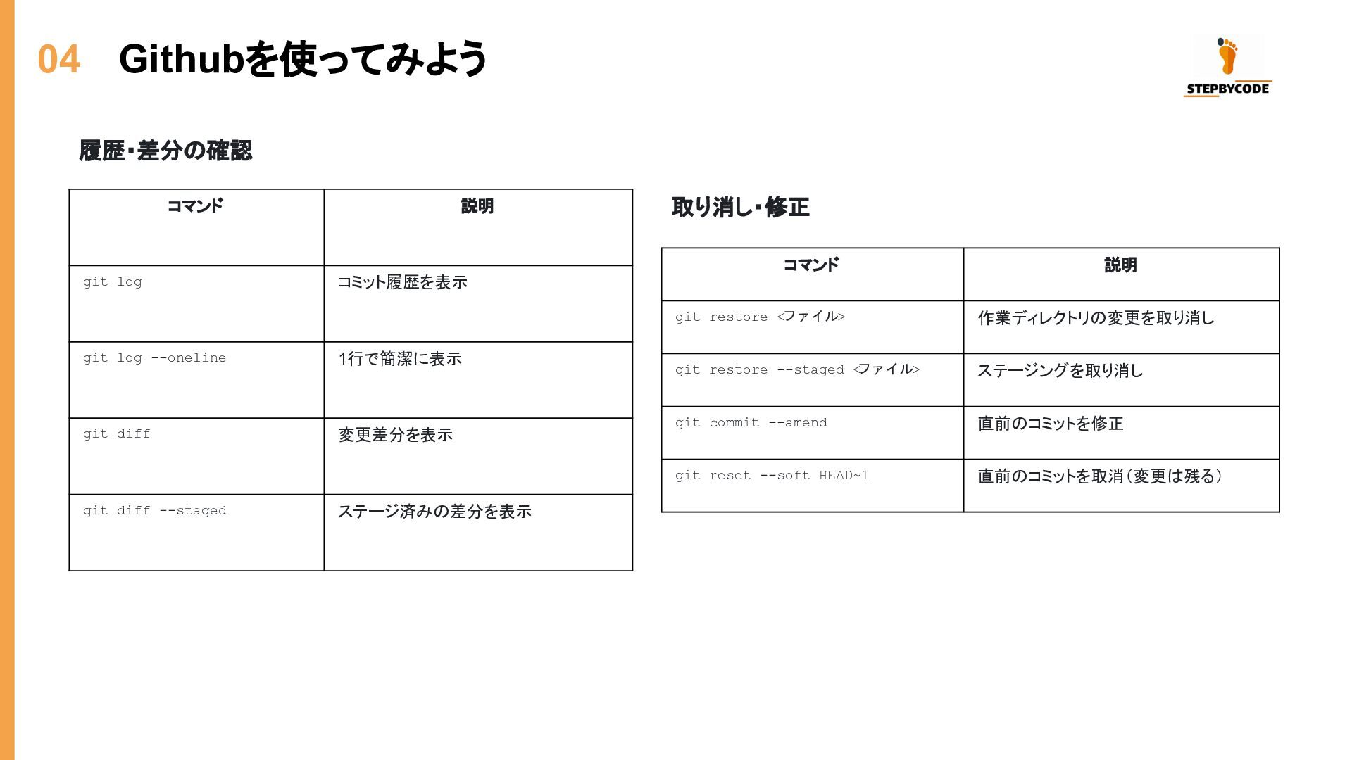 04 Githubを使ってみよう コマンド 説明 git log コミット履歴を表示 git log --oneline