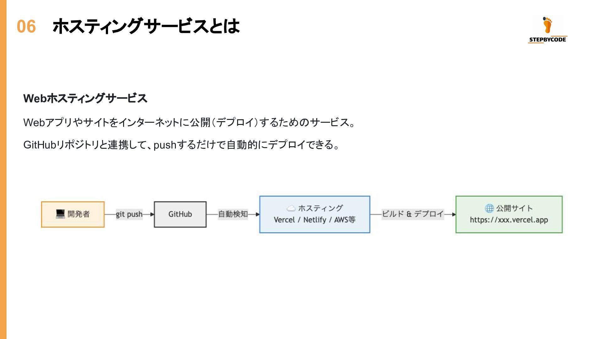 06 ホスティングサービスとは Webホスティングサービス Webアプリやサイトをインターネットに公開(デプロイ)するためのサービス。 GitHubリポジトリと連携して、pushするだけで自動的にデプロイできる。