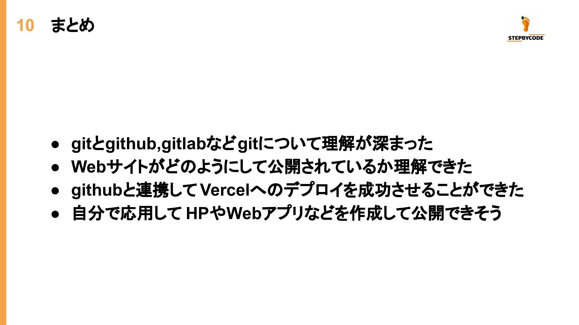 10 まとめ • gitとgithub,gitlabなどgitについて理解が深まった • Webサイトがどのようにして公開されているか理解できた • githubと連携して Vercelへのデプロイを成功させることができた •