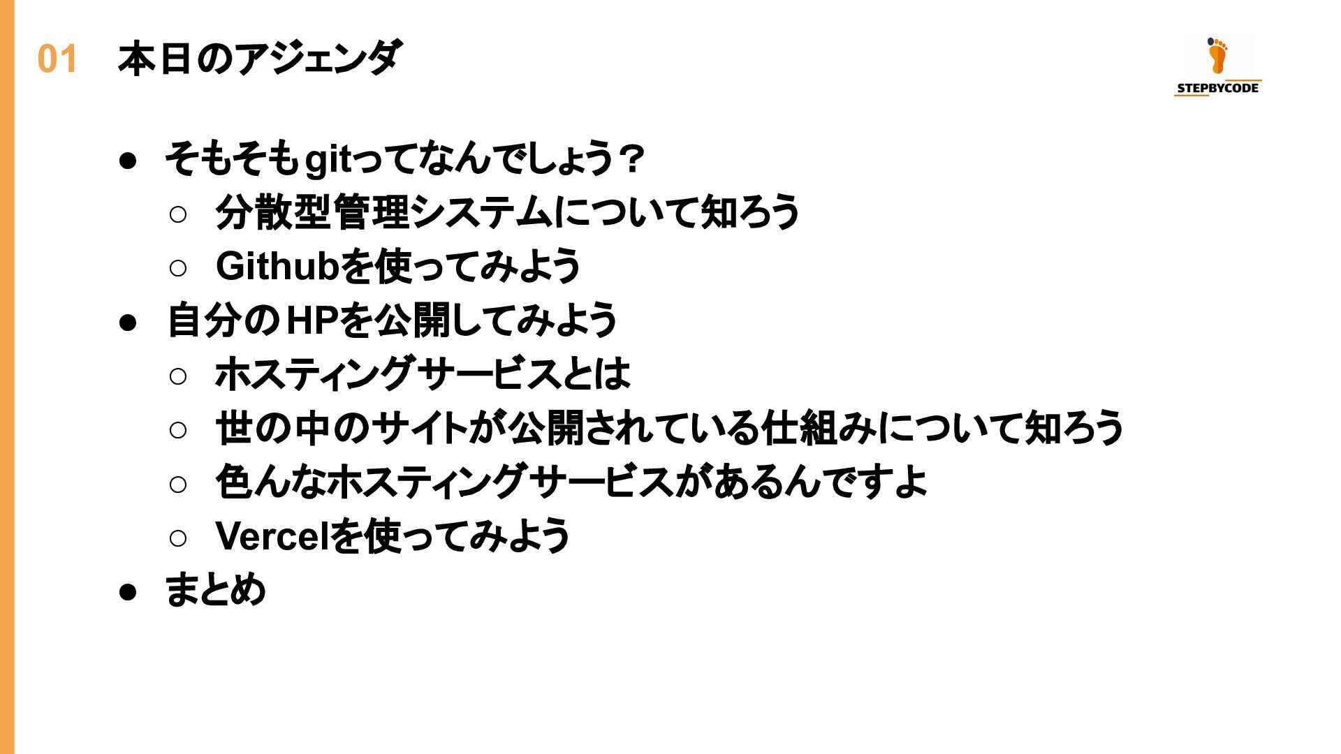 01 本日のアジェンダ • そもそもgitってなんでしょう? ◦ 分散型管理システムについて知ろう ◦ Githubを使ってみよう • 自分のHPを公開してみよう