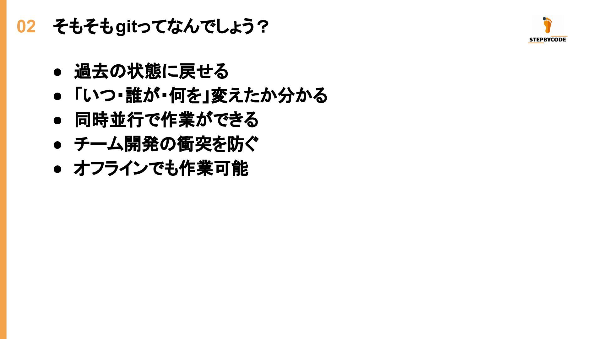 02 そもそもgitってなんでしょう? • 過去の状態に戻せる • 「いつ・誰が・何を」変えたか分かる • 同時並行で作業ができる • チーム開発の衝突を防ぐ