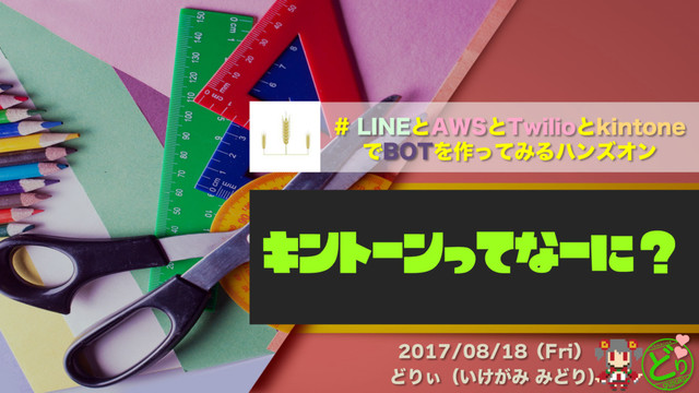 -*/&ͱ"84ͱ5XJMJPͱLJOUPOF Ͱ#05Λ࡞ͬͯΈΔϋϯζΦϯ 2017/08/18(Fri) ͲΓ͌ʢ͍͚͕Έ ΈͲΓʣ キントーンってなーに?
