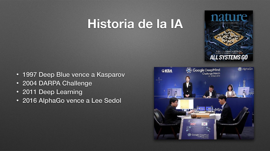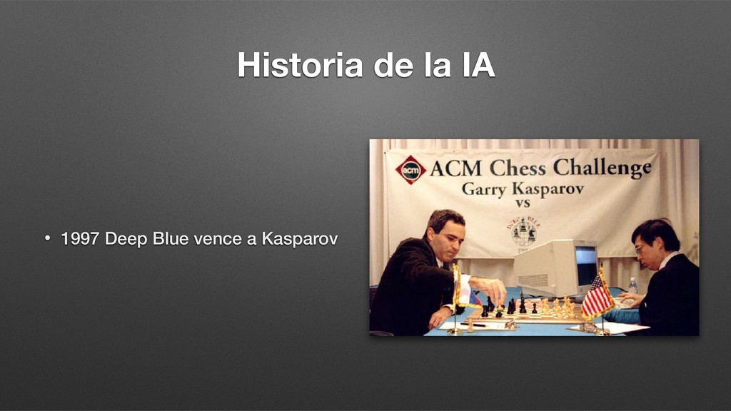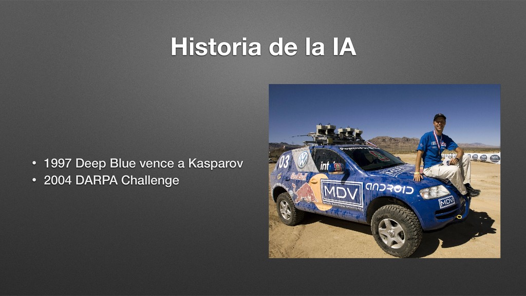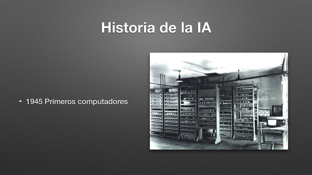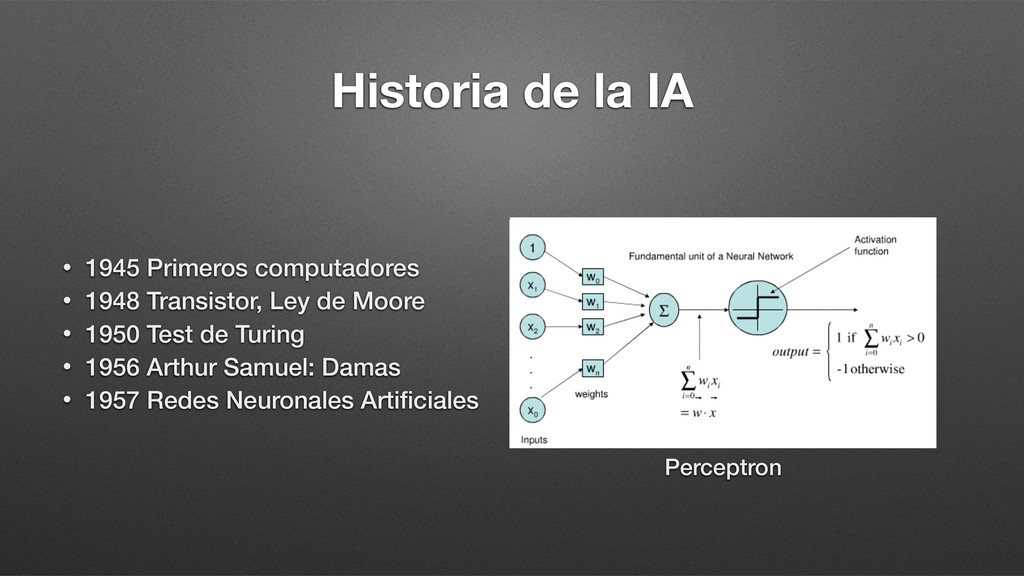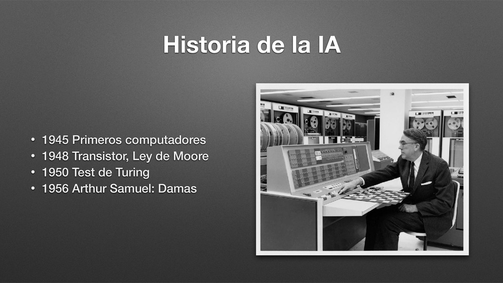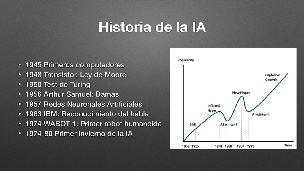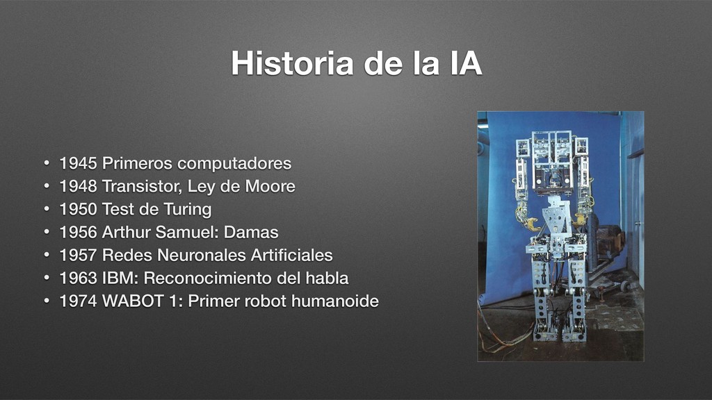 Transistor, Ley de Moore • 1950 Test de Turing • 1956 Arthur Samuel: Damas • 1957 Redes Neuronales Artificiales • 1963 IBM: Reconocimiento del habla • 1974 WABOT 1: Primer robot humanoide • 1974-80 Primer invierno de la IA