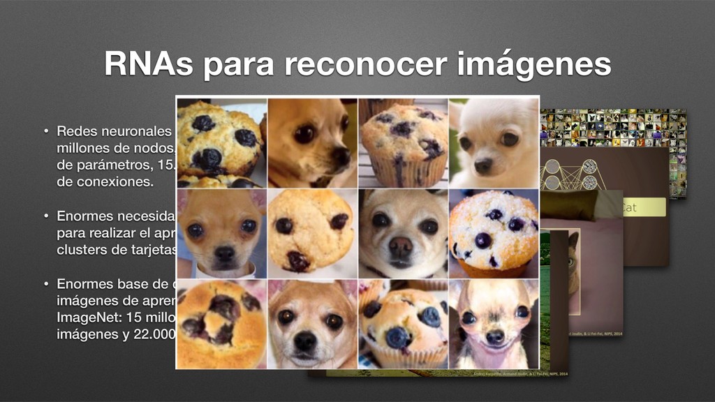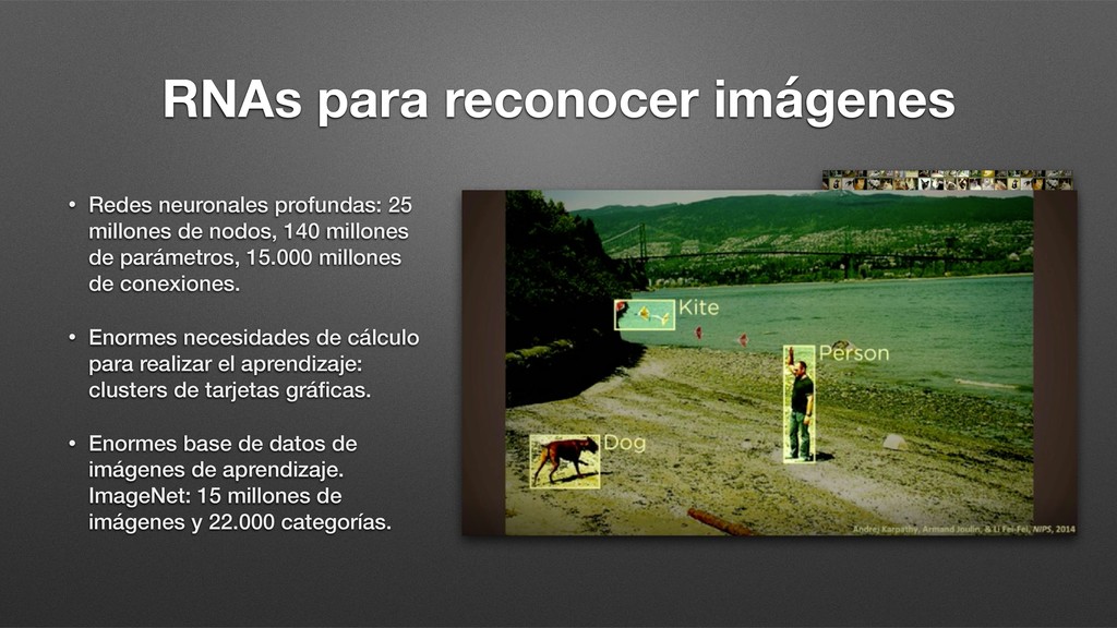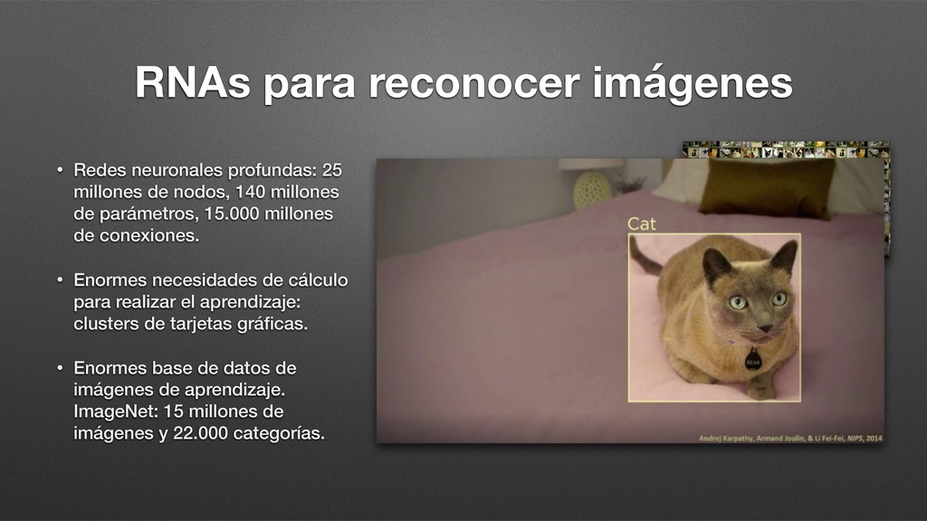 de nodos, 140 millones de parámetros, 15.000 millones de conexiones. • Enormes necesidades de cálculo para realizar el aprendizaje: clusters de tarjetas gráficas. • Enormes base de datos de imágenes de aprendizaje. ImageNet: 15 millones de imágenes y 22.000 categorías.