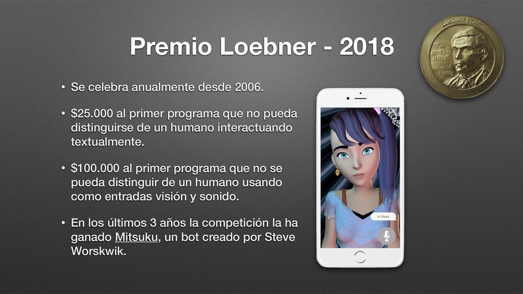 • $25.000 al primer programa que no pueda distinguirse de un humano interactuando textualmente. • $100.000 al primer programa que no se pueda distinguir de un humano usando como entradas visión y sonido. • En los últimos 3 años la competición la ha ganado Mitsuku, un bot creado por Steve Worskwik.