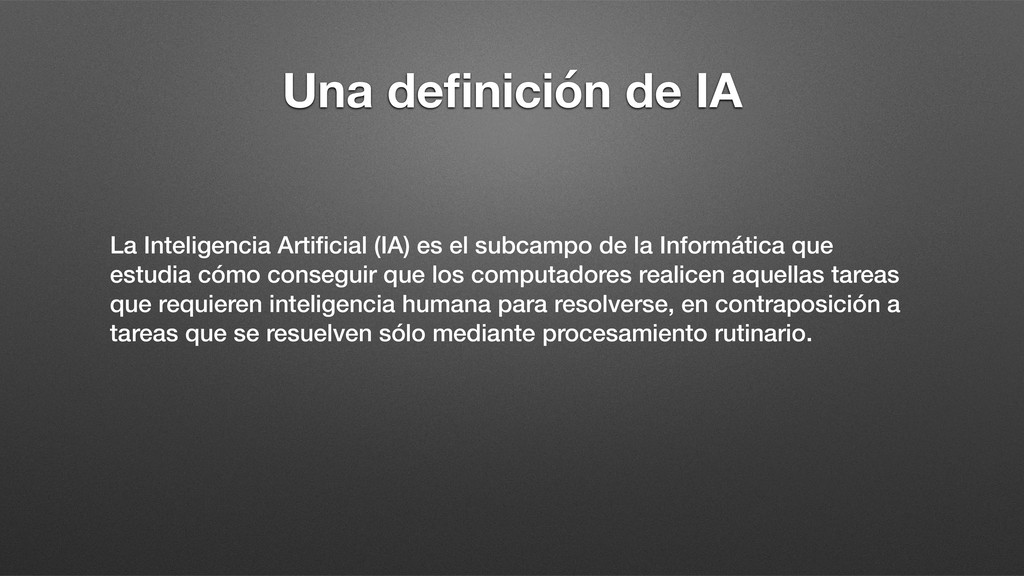 subcampo de la Informática que estudia cómo conseguir que los computadores realicen aquellas tareas que requieren inteligencia humana para resolverse, en contraposición a tareas que se resuelven sólo mediante procesamiento rutinario.