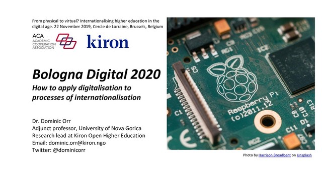 age. 22 November 2019, Cercle de Lorraine, Brussels, Belgium Bologna Digital 2020 How to apply digitalisation to processes of internationalisation Dr. Dominic Orr Adjunct professor, University of Nova Gorica Research lead at Kiron Open Higher Education Email: [email protected] Twitter: @dominicorr Photo by Harrison Broadbent on Unsplash
