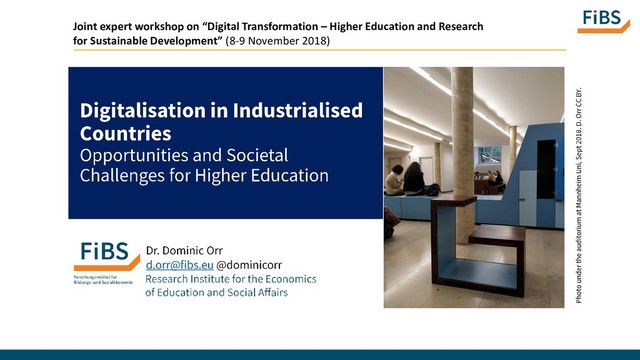 Presentation at DIE/DAAD Joint expert workshop on “Digital Transformation – Higher Education and Research for Sustainable Development” (8-9 November 2018, DAAD Bonn). This paper defines sustainable development in reference to the United Nations’ Sustainable Development Goals. It sees the role of higher education in both harnessing digital technology to ensure access to higher quality learning for all and in using the potential of digital networks for expanding and intensifying exchange and sharing of new knowledge and for working together on the grand challenges affecting our interconnected world.