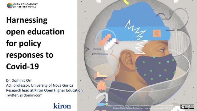 Nations Global Call Out To Creatives - help stop the spread of COVID-19. Dr. Dominic Orr Adj. professor, University of Nova Gorica Research lead at Kiron Open Higher Education Twitter: @dominicorr Harnessing open education for policy responses to Covid-19