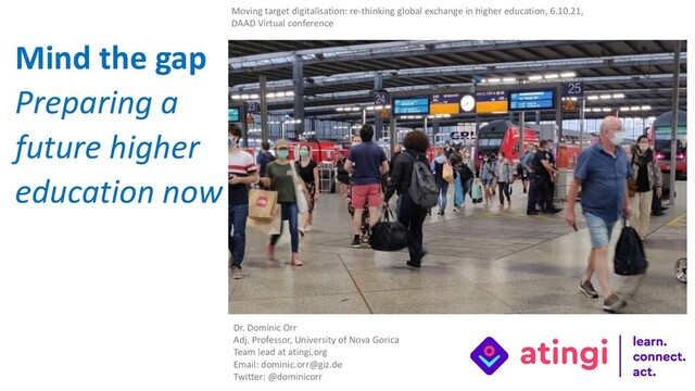 DAAD Virtual conference Virtual exchange: Borderless mobility between European Higher Education Area and Regions Beyond Dr. Dominic Orr Adj. Professor, University of Nova Gorica Team lead at atingi.org Email: [email protected] Twitter: @dominicorr Photo D. Orr, Milan Airport, Nov. 2019, The Seven Sages, Fausto Melotti, CC BY Mind the gap Preparing a future higher education now