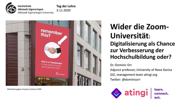Hochschulbildung oder? Dr. Dominic Orr Adjunct professor, University of Nova Gorica GIZ, management team atingi.org Twitter: @dominicorr Werbekampagne innocent, Sommer 2020 Tag der Lehre 3.11.2020