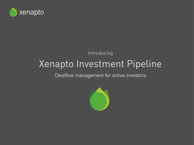tags, notes & analysis data Crowdsource opinions from colleagues and valued collaborators Put peers into groups (unless Xenapto's already done it for you) Phase 2: prioritise the strong candidates Now you'll be talking to the founders – email your notes right into Xenapto Each candidate company has its own dataroom for secure storage of confidential documents Build a detailed profile of how they fit with your investment criteria and publish proposals for your Investment Committee Phase 1: making a shortlist Which candidates don't match your investment themes or other geographical or maturity preferences? Which candidates are being outperformed by their peers? Are they raising at the right time for your capital availability?