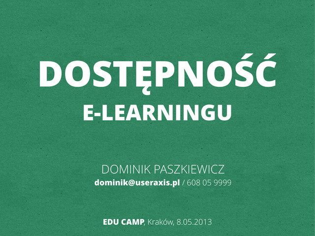 napisy do filmów I rób napisy. Spróbuj www.amara.org Sprawdź kontrast treści www.paciellogroup.com/resources/contr astAnalyser Naucz się (trochę) HTML Dbaj zawsze o semantykę treści. Czy Twój LM S jest używalny? Zapytaj się kogokolwiek spoza branży. Przeczytaj mój podręcznik www.useraxis.pl/podrecznik.pdf Sprawdź czy Twoje narzędzia i metody gwarantują dostępność? Naucz się audytować treści internetowe. Poradnik dla początkujących www.dostepne.info/audytor Zapytaj niewidomego czy Twoje kursy są przyjazne. Zrób jeden kurs w pełni dostępny dla narażonych na wykluczenie cyfrowe. Zawsze myśl o dostępności od początku projektowania.
