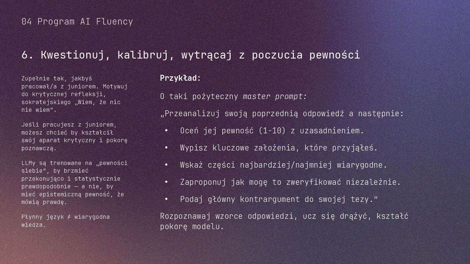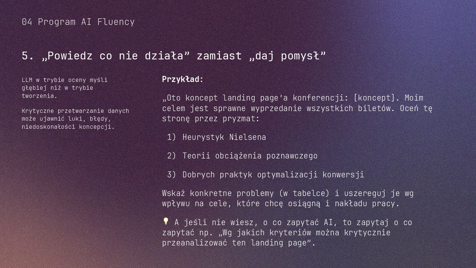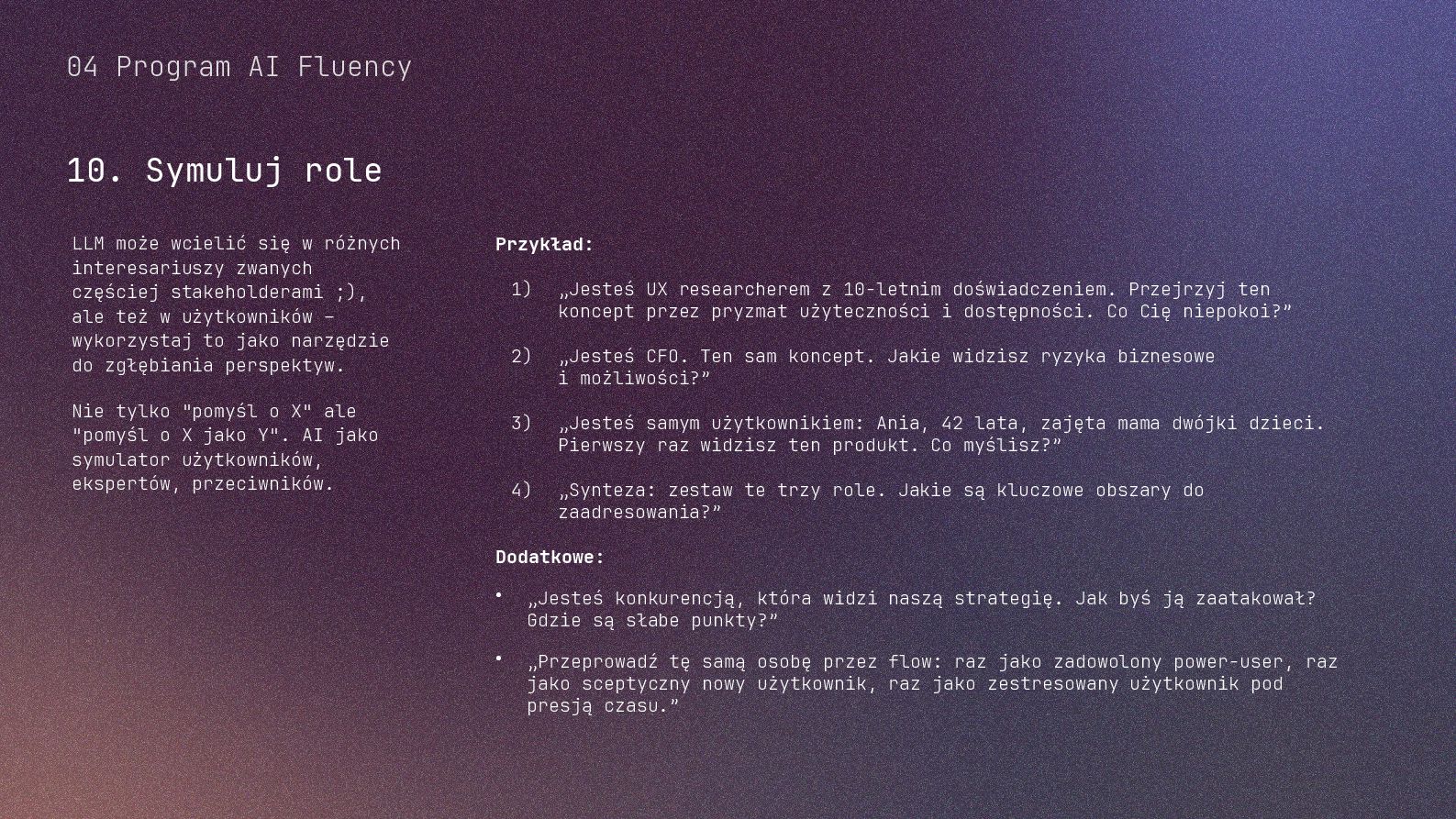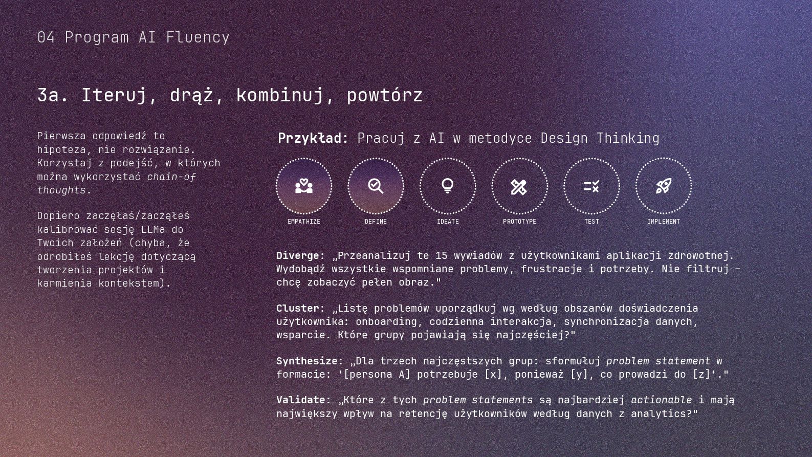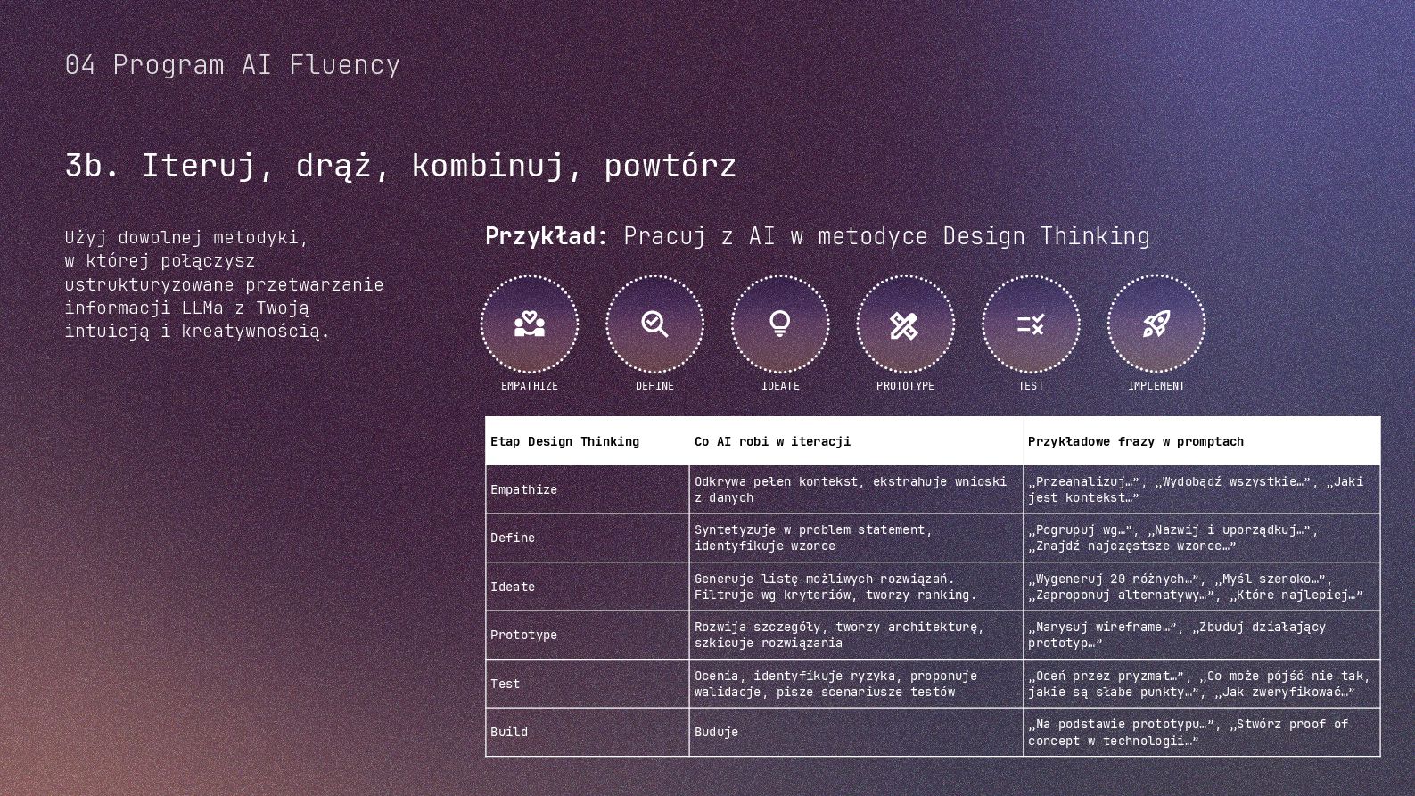 w metodyce Design Thinking Etap Design Thinking Co AI robi w iteracji Przykładowe frazy w promptach Empathize Odkrywa pełen kontekst, ekstrahuje wnioski z danych „Przeanalizuj…”, „Wydobądź wszystkie…”, „Jaki jest kontekst…” Define Syntetyzuje w problem statement, identyfikuje wzorce „Pogrupuj wg…”, „Nazwij i uporządkuj…”, „Znajdź najczęstsze wzorce…” Ideate Generuje listę możliwych rozwiązań. Filtruje wg kryteriów, tworzy ranking. „Wygeneruj 20 różnych…”, „Myśl szeroko…”, „Zaproponuj alternatywy…”, „Które najlepiej…” Prototype Rozwija szczegóły, tworzy architekturę, szkicuje rozwiązania „Narysuj wireframe…”, „Zbuduj działający prototyp…” Test Ocenia, identyfikuje ryzyka, proponuje walidacje, pisze scenariusze testów „Oceń przez pryzmat…”, „Co może pójść nie tak, jakie są słabe punkty…”, „Jak zweryfikować…” Build Buduje „Na podstawie prototypu…”, „Stwórz proof of concept w technologii…” Użyj dowolnej metodyki, w której połączysz ustrukturyzowane przetwarzanie informacji LLMa z Twoją intuicją i kreatywnością. 04 Program AI Fluency 3b. Iteruj, drąż, kombinuj, powtórz