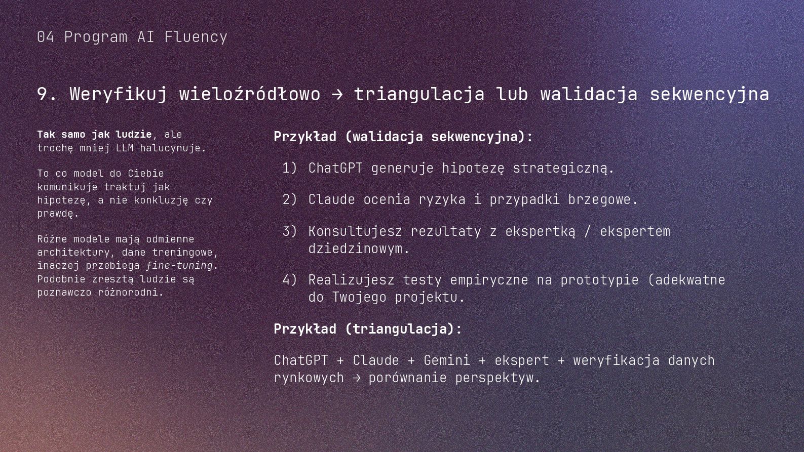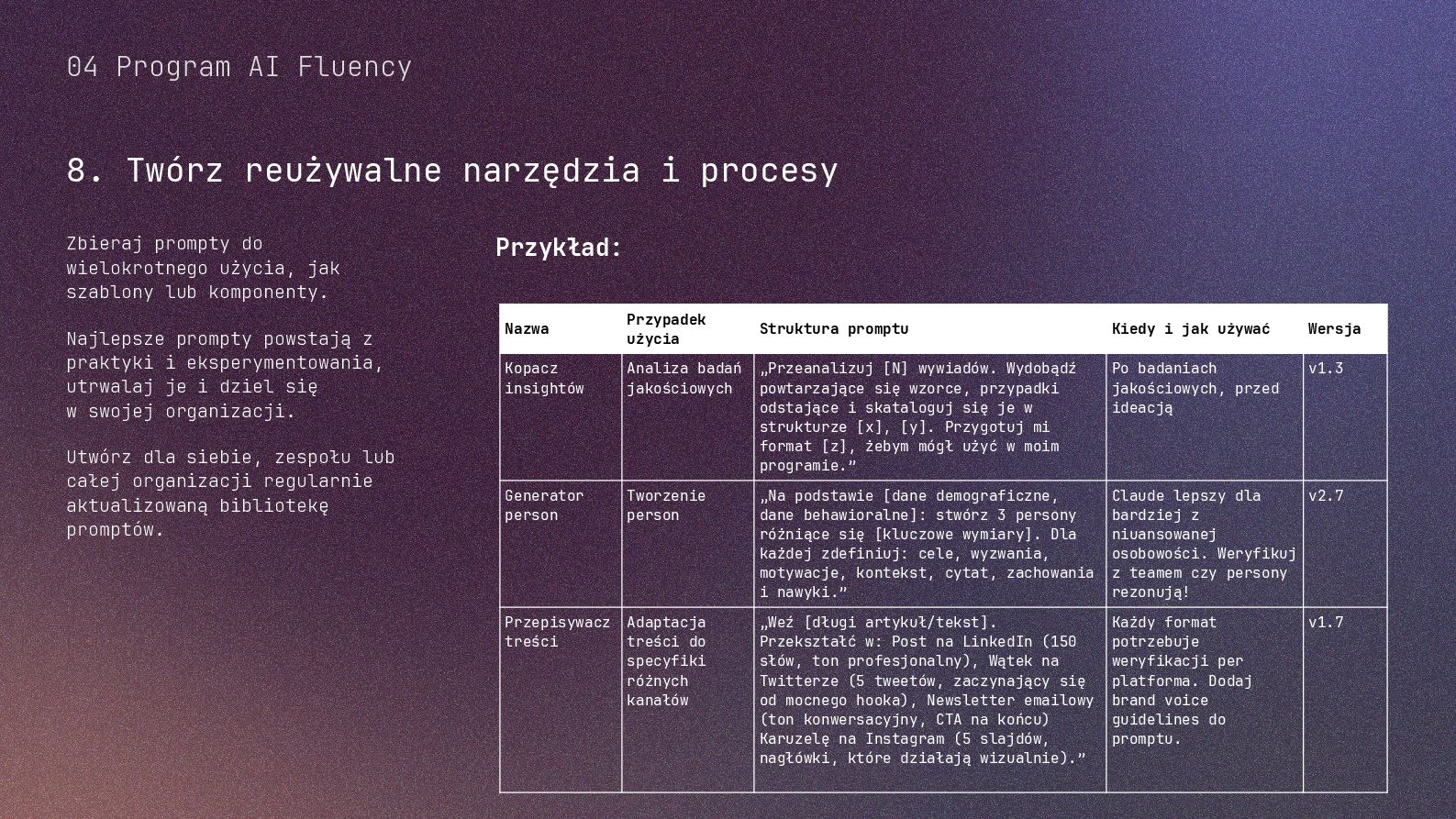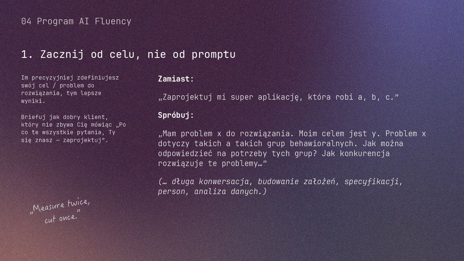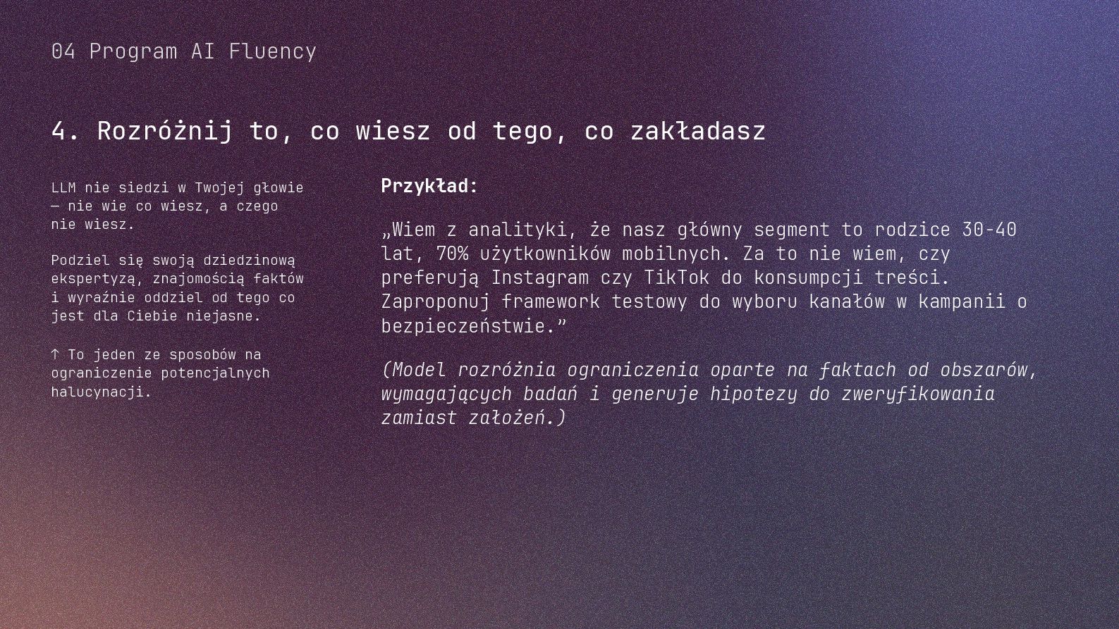 w metodyce Design Thinking Etap Design Thinking Co AI robi w iteracji Przykładowe frazy w promptach Empathize Odkrywa pełen kontekst, ekstrahuje wnioski z danych „Przeanalizuj…”, „Wydobądź wszystkie…”, „Jaki jest kontekst…” Define Syntetyzuje w problem statement, identyfikuje wzorce „Pogrupuj wg…”, „Nazwij i uporządkuj…”, „Znajdź najczęstsze wzorce…” Ideate Generuje listę możliwych rozwiązań. Filtruje wg kryteriów, tworzy ranking. „Wygeneruj 20 różnych…”, „Myśl szeroko…”, „Zaproponuj alternatywy…”, „Które najlepiej…” Prototype Rozwija szczegóły, tworzy architekturę, szkicuje rozwiązania „Narysuj wireframe…”, „Zbuduj działający prototyp…” Test Ocenia, identyfikuje ryzyka, proponuje walidacje, pisze scenariusze testów „Oceń przez pryzmat…”, „Co może pójść nie tak, jakie są słabe punkty…”, „Jak zweryfikować…” Build Buduje „Na podstawie prototypu…”, „Stwórz proof of concept w technologii…” Użyj dowolnej metodyki, w której połączysz ustrukturyzowane przetwarzanie informacji LLMa z Twoją intuicją i kreatywnością. 04 Program AI Fluency 3b. Iteruj, drąż, kombinuj, powtórz