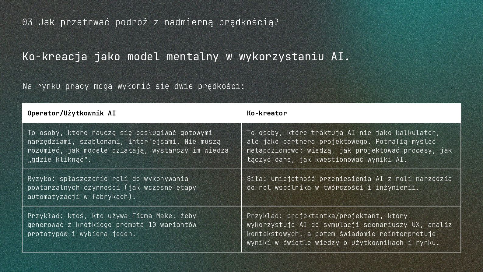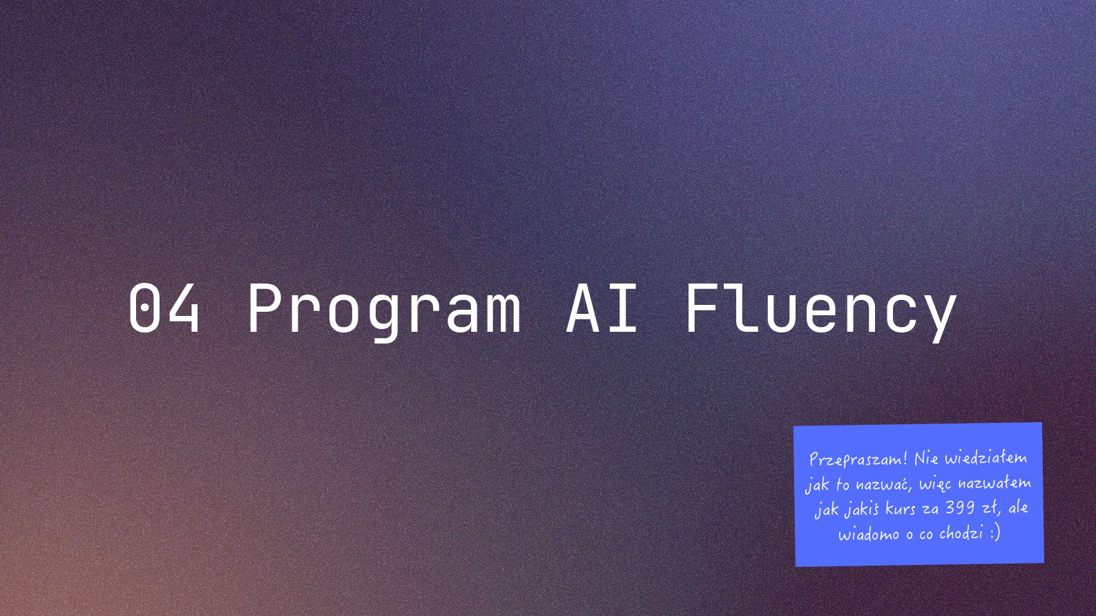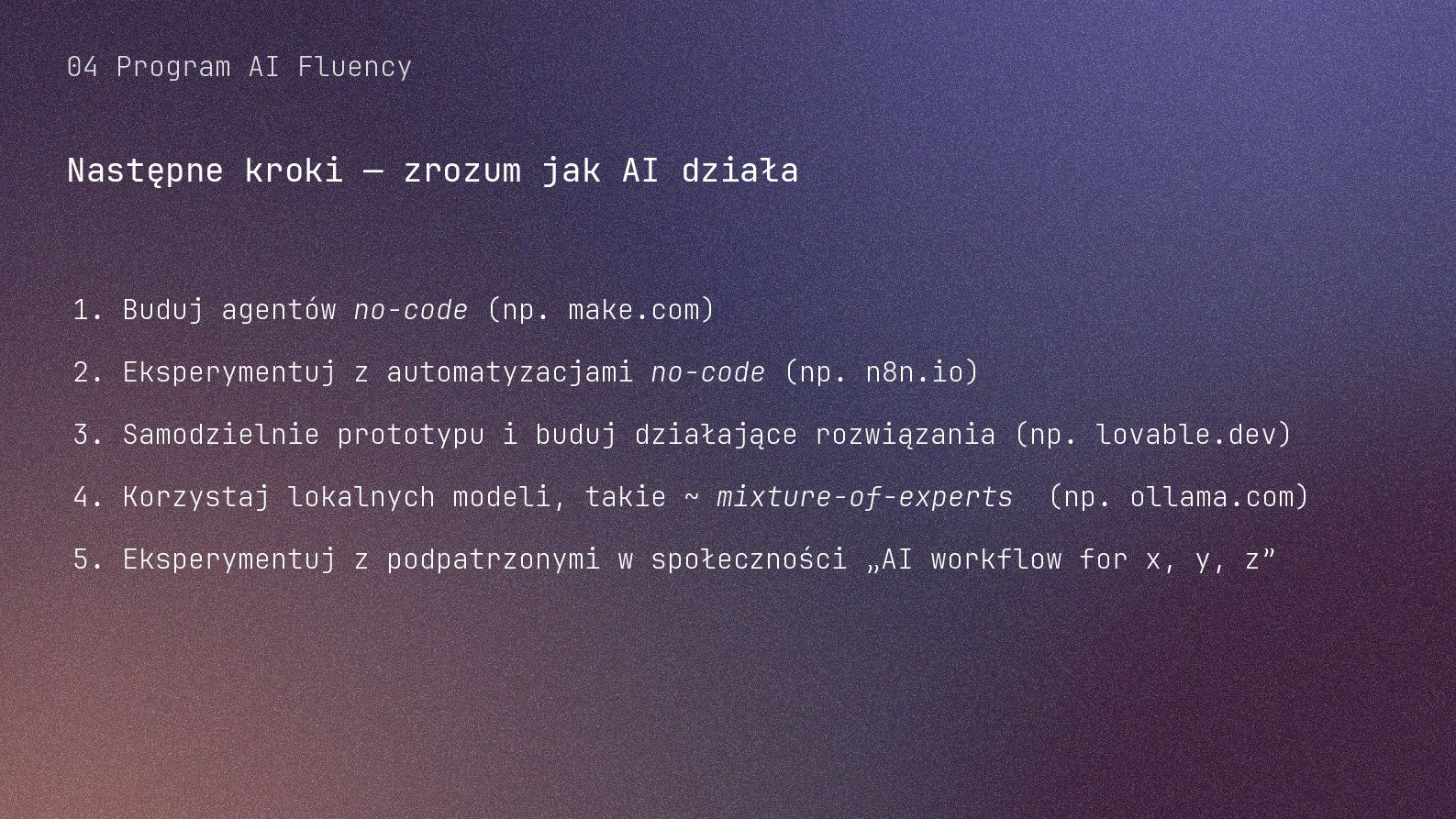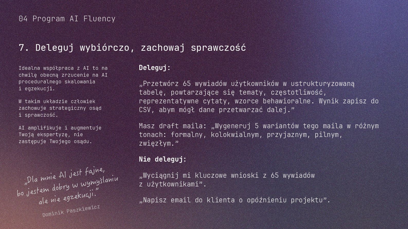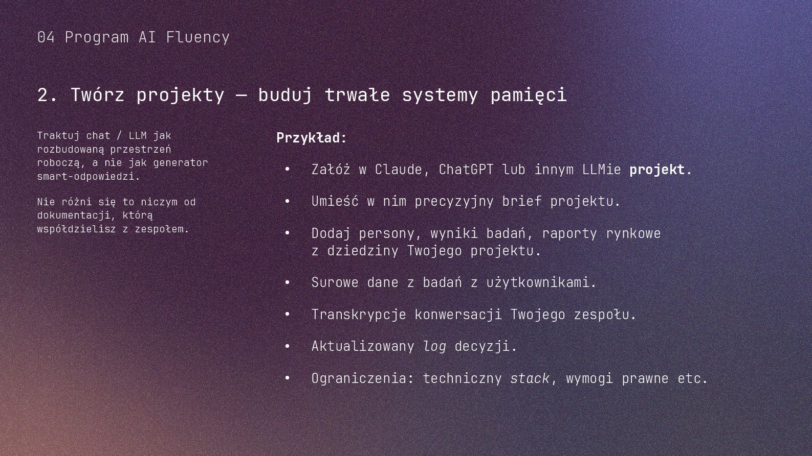 w metodyce Design Thinking Etap Design Thinking Co AI robi w iteracji Przykładowe frazy w promptach Empathize Odkrywa pełen kontekst, ekstrahuje wnioski z danych „Przeanalizuj…”, „Wydobądź wszystkie…”, „Jaki jest kontekst…” Define Syntetyzuje w problem statement, identyfikuje wzorce „Pogrupuj wg…”, „Nazwij i uporządkuj…”, „Znajdź najczęstsze wzorce…” Ideate Generuje listę możliwych rozwiązań. Filtruje wg kryteriów, tworzy ranking. „Wygeneruj 20 różnych…”, „Myśl szeroko…”, „Zaproponuj alternatywy…”, „Które najlepiej…” Prototype Rozwija szczegóły, tworzy architekturę, szkicuje rozwiązania „Narysuj wireframe…”, „Zbuduj działający prototyp…” Test Ocenia, identyfikuje ryzyka, proponuje walidacje, pisze scenariusze testów „Oceń przez pryzmat…”, „Co może pójść nie tak, jakie są słabe punkty…”, „Jak zweryfikować…” Build Buduje „Na podstawie prototypu…”, „Stwórz proof of concept w technologii…” Użyj dowolnej metodyki, w której połączysz ustrukturyzowane przetwarzanie informacji LLMa z Twoją intuicją i kreatywnością. 04 Program AI Fluency 3b. Iteruj, drąż, kombinuj, powtórz