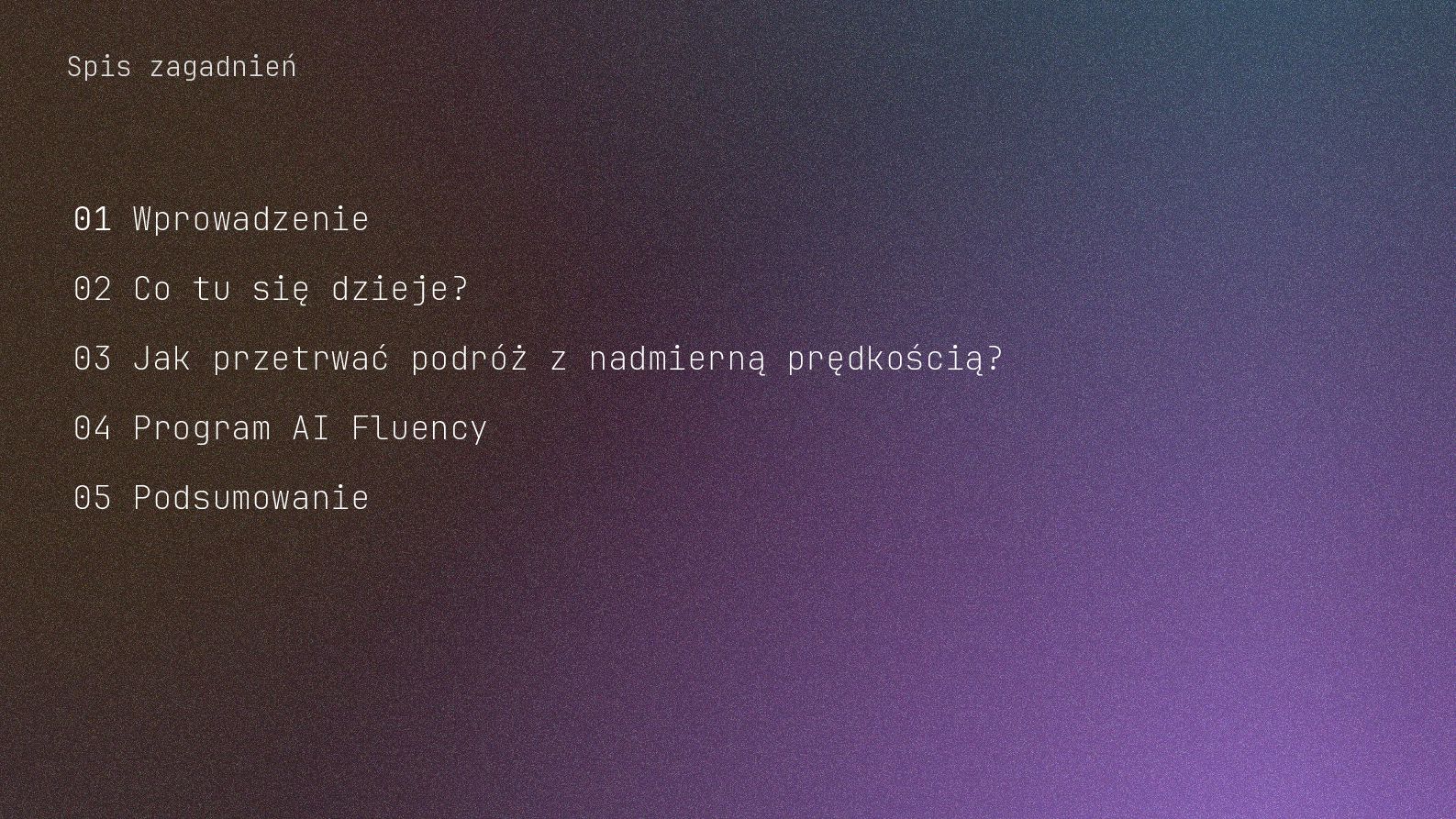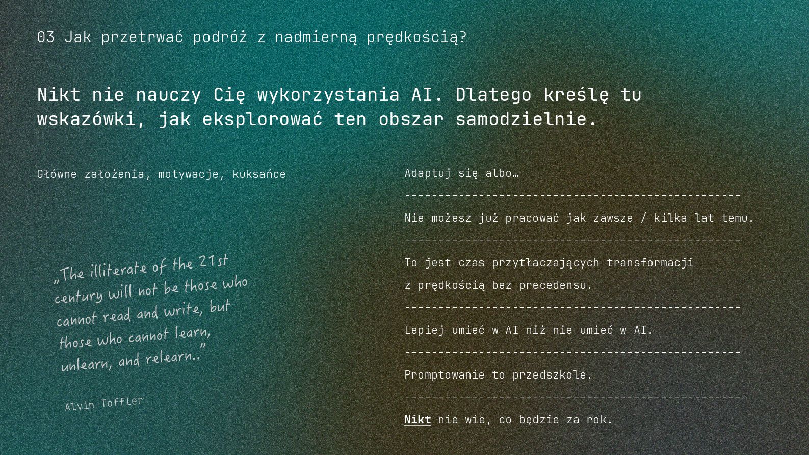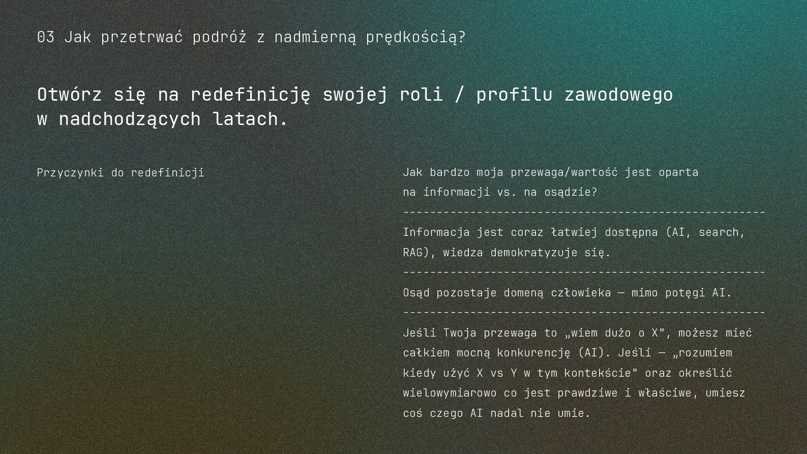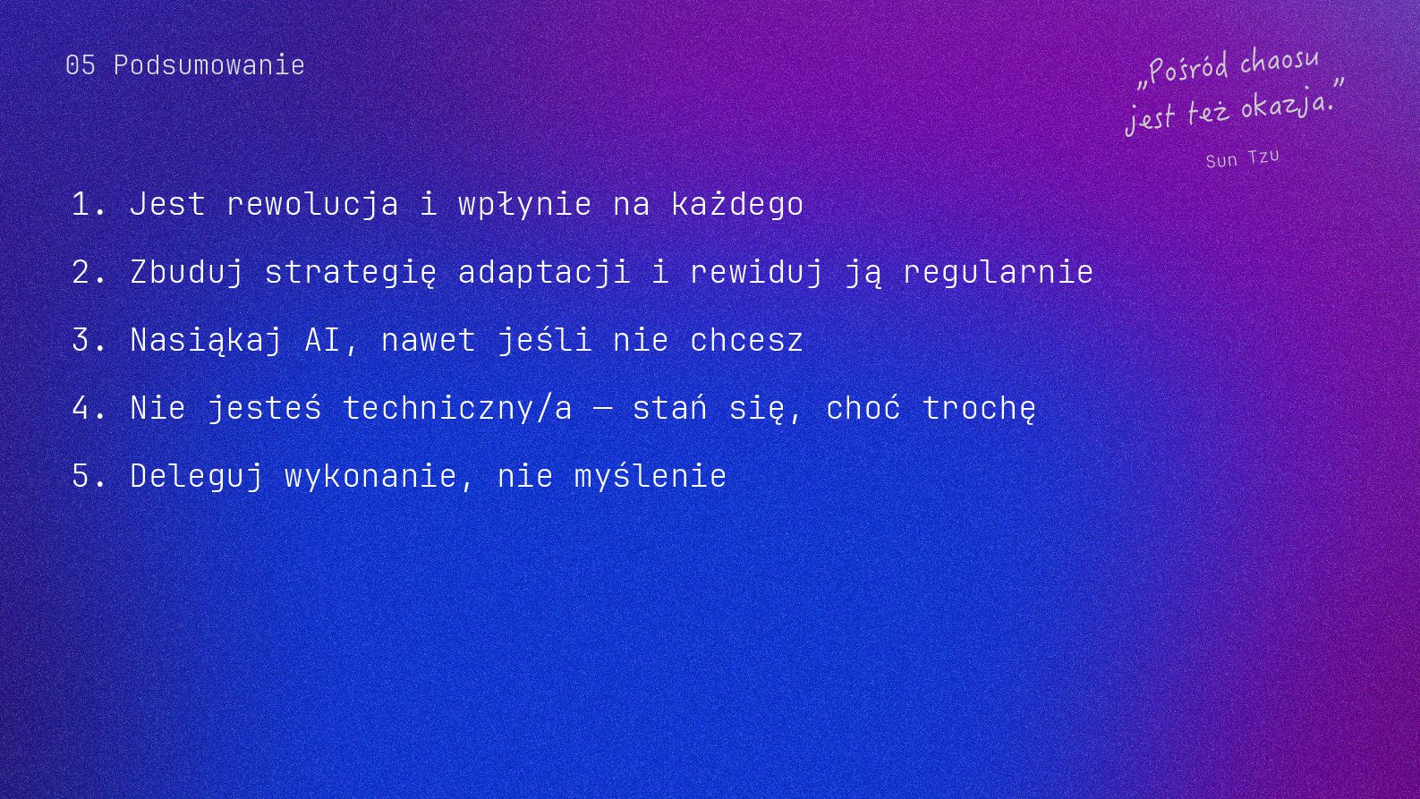 w metodyce Design Thinking Etap Design Thinking Co AI robi w iteracji Przykładowe frazy w promptach Empathize Odkrywa pełen kontekst, ekstrahuje wnioski z danych „Przeanalizuj…”, „Wydobądź wszystkie…”, „Jaki jest kontekst…” Define Syntetyzuje w problem statement, identyfikuje wzorce „Pogrupuj wg…”, „Nazwij i uporządkuj…”, „Znajdź najczęstsze wzorce…” Ideate Generuje listę możliwych rozwiązań. Filtruje wg kryteriów, tworzy ranking. „Wygeneruj 20 różnych…”, „Myśl szeroko…”, „Zaproponuj alternatywy…”, „Które najlepiej…” Prototype Rozwija szczegóły, tworzy architekturę, szkicuje rozwiązania „Narysuj wireframe…”, „Zbuduj działający prototyp…” Test Ocenia, identyfikuje ryzyka, proponuje walidacje, pisze scenariusze testów „Oceń przez pryzmat…”, „Co może pójść nie tak, jakie są słabe punkty…”, „Jak zweryfikować…” Build Buduje „Na podstawie prototypu…”, „Stwórz proof of concept w technologii…” Użyj dowolnej metodyki, w której połączysz ustrukturyzowane przetwarzanie informacji LLMa z Twoją intuicją i kreatywnością. 04 Program AI Fluency 3b. Iteruj, drąż, kombinuj, powtórz