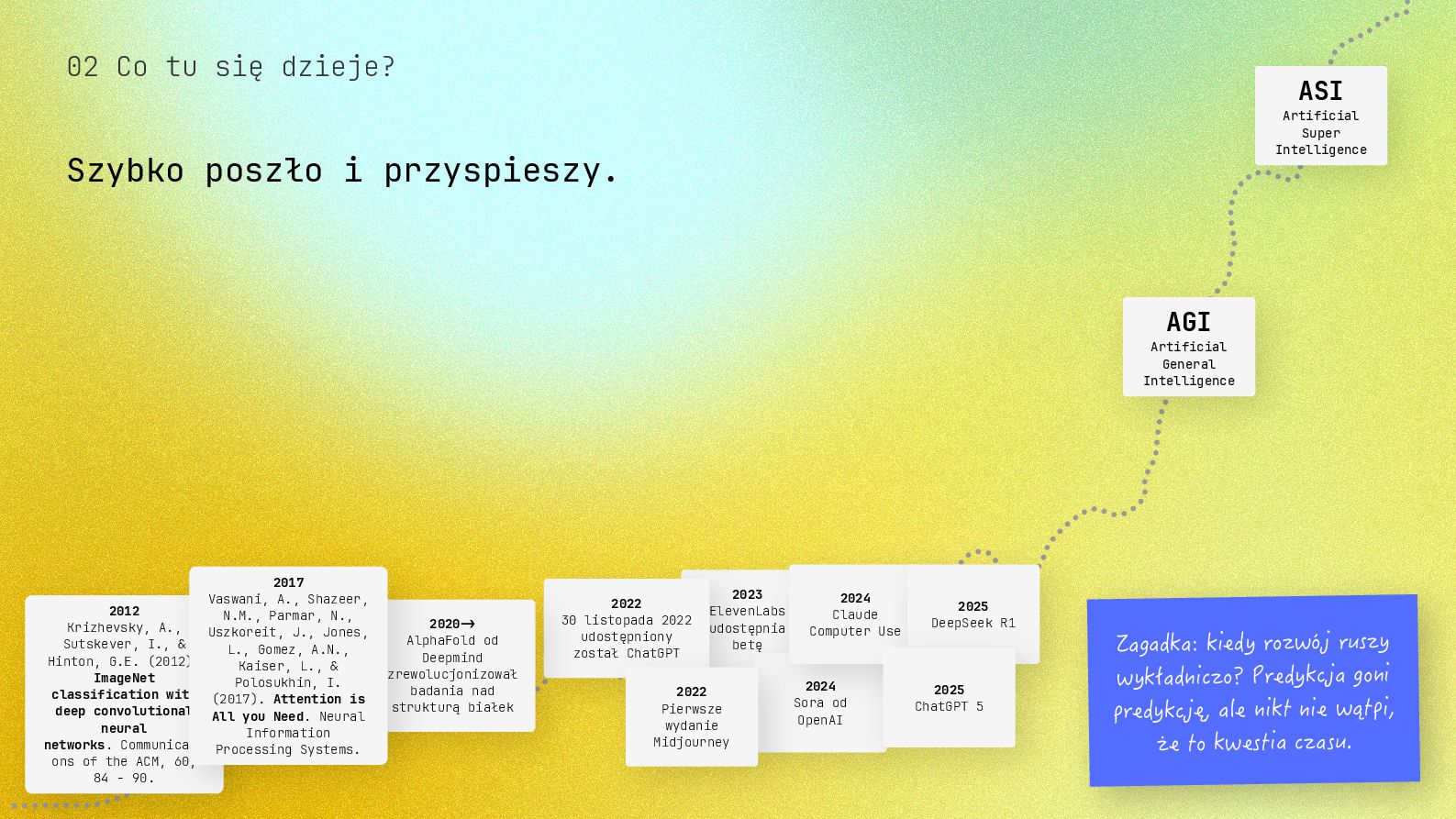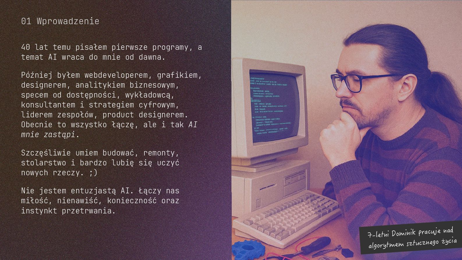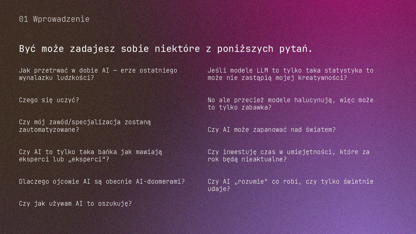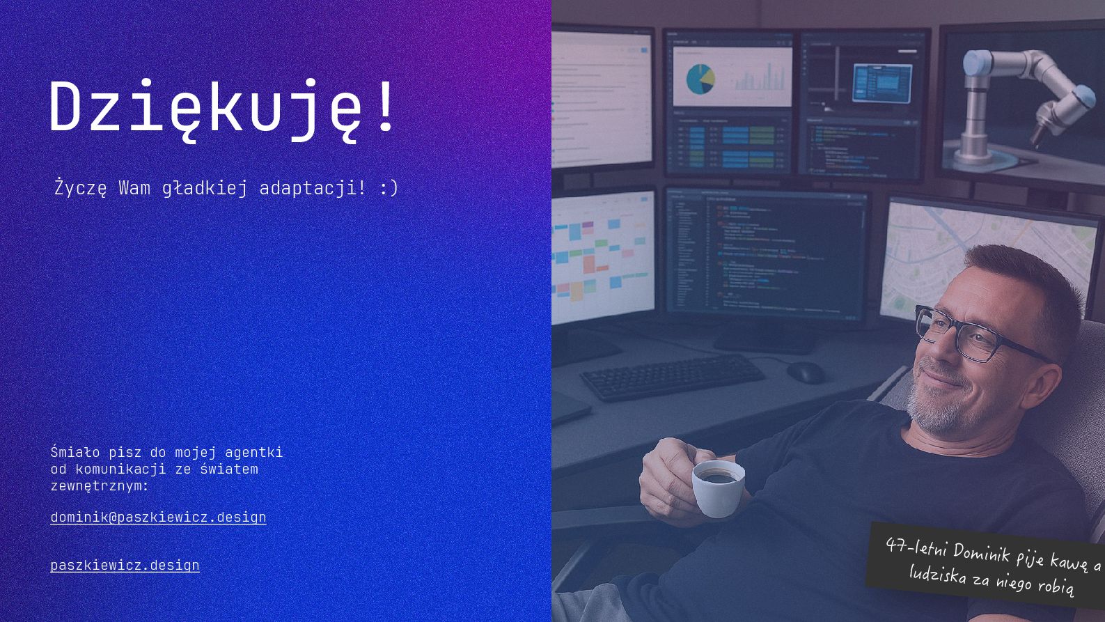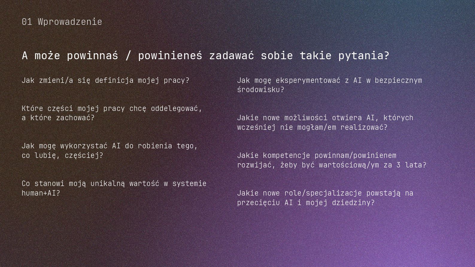 w metodyce Design Thinking Etap Design Thinking Co AI robi w iteracji Przykładowe frazy w promptach Empathize Odkrywa pełen kontekst, ekstrahuje wnioski z danych „Przeanalizuj…”, „Wydobądź wszystkie…”, „Jaki jest kontekst…” Define Syntetyzuje w problem statement, identyfikuje wzorce „Pogrupuj wg…”, „Nazwij i uporządkuj…”, „Znajdź najczęstsze wzorce…” Ideate Generuje listę możliwych rozwiązań. Filtruje wg kryteriów, tworzy ranking. „Wygeneruj 20 różnych…”, „Myśl szeroko…”, „Zaproponuj alternatywy…”, „Które najlepiej…” Prototype Rozwija szczegóły, tworzy architekturę, szkicuje rozwiązania „Narysuj wireframe…”, „Zbuduj działający prototyp…” Test Ocenia, identyfikuje ryzyka, proponuje walidacje, pisze scenariusze testów „Oceń przez pryzmat…”, „Co może pójść nie tak, jakie są słabe punkty…”, „Jak zweryfikować…” Build Buduje „Na podstawie prototypu…”, „Stwórz proof of concept w technologii…” Użyj dowolnej metodyki, w której połączysz ustrukturyzowane przetwarzanie informacji LLMa z Twoją intuicją i kreatywnością. 04 Program AI Fluency 3b. Iteruj, drąż, kombinuj, powtórz