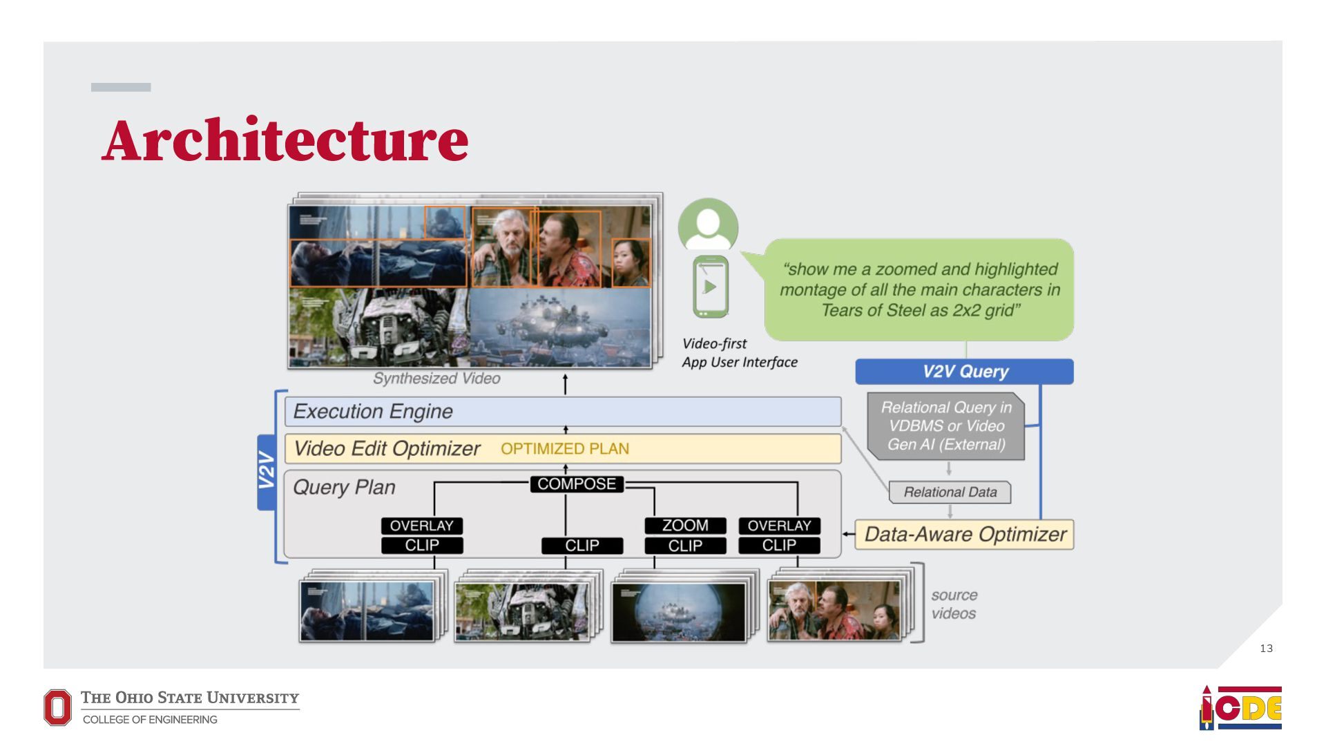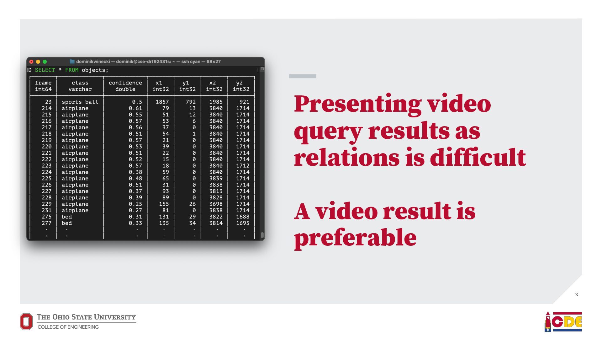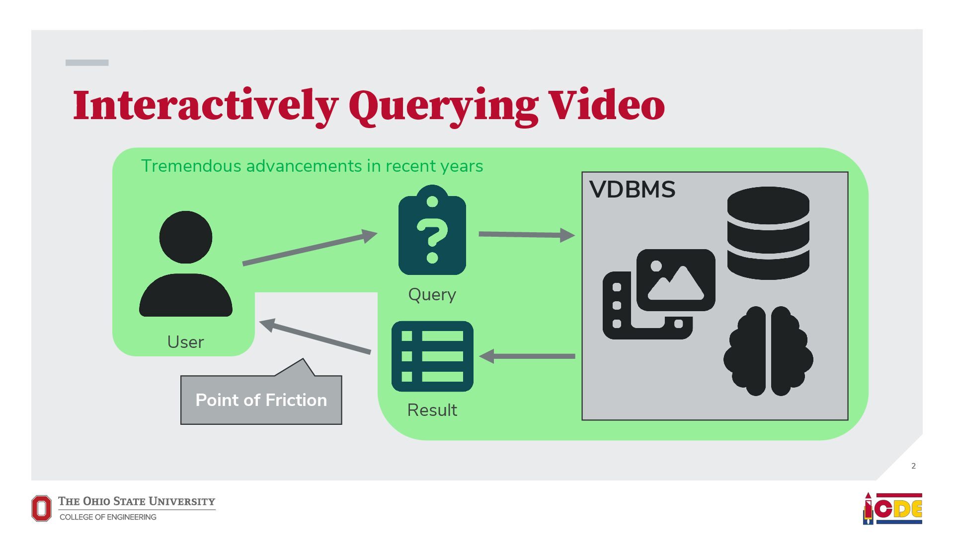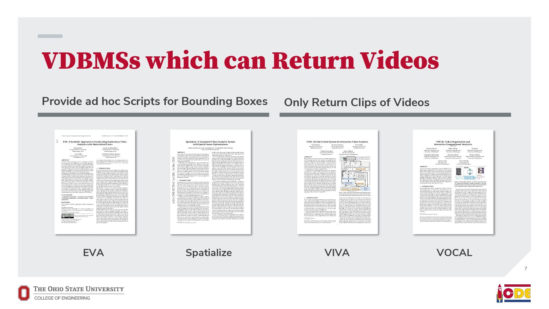 [email protected] University of Washington ABSTRACT Current video database management systems (VDBMSs) fail to support the growing number of video datasets in diverse domains because these systems assume clean data and rely on pretrained models to detect known objects or actions. Existing systems also lack good support for compositional queries that seek events con- sisting of multiple objects with complex spatial and temporal rela- tionships. In this paper, we propose VOCAL, a vision of a VDBMS that supports ecient data cleaning, exploration and organization, and compositional queries, even when no pretrained model exists to extract semantic content. These techniques utilize optimizations to minimize the manual eort required of users. 1 INTRODUCTION In many application domains—ranging from scientic research to urban planning—the use of large video datasets has become com- mon in great part because camera quality continues to improve and storage remains aordable. Video datasets capture content from diverse domains and support widely varying applications, such as using cameras mounted on vehicles to understand how neigh- borhoods evolved through the pandemic [39], using animal-borne cameras to investigate animal (e.g., shark) habitat preferences [28], or using citywide camera networks to measure the eect of traf- c interventions on crowded city streets [55]. In response to the proliferation of video datasets and applications, recent work has pushed the state of the art in the eld of video database manage- ment systems (VDBMSs) [1, 12, 23, 31, 37]. These systems, however, (i) expect clean video data, (ii) require pretrained machine learning models to detect objects or actions, and (iii) have limited or no sup- port for compositional queries about multiple objects interacting over time. ∗Both authors contributed equally to the paper This paper is published under the Creative Commons Attribution 4.0 International (CC-BY 4.0) license. Authors reserve their rights to disseminate the work on their personal and corporate Web sites with the appropriate attribution, provided that you attribute the original work to the authors and CIDR 2022. 12th Annual Conference on Innovative Data Systems Research (CIDR ’22). January 10-13, 2022, Chaminade, USA. Large-scale dirty video dataset Compositional event Find “one deer foraging followed by multiple deer traveling” User-defined query Output video segments with one deer foraging followed by multiple deer traveling VOCAL Interactive video data cleaning Interactive exploration and labeling Compositional query processing … … Foraging Traveling Figure 1: We introduce VOCAL, an end-to-end video analyt- ics system that facilitates cleaning, exploration, and com- positional query processing over large-scale video datasets, even for domains where no pretrained models exist. In contrast, most real world collection eorts violate all three assumptions. They result in videos with dirty data. They often lack domain-specic models to support the target application. Users would like to ask complex, compositional queries on their data. As a motivating example, we are working with a dataset of videos captured by cameras attached to wild deer (Odocoileus spp.) [16]. The videos are to be used to provide insight into deer activity patterns: How much time do deer spend foraging versus lying down? How do environmental conditions (e.g., slope and depth of snow) aect deer activity? The collected data is dirty: camera lenses are often obscured by snow for a large fraction of time (up to 75%), requiring that scientists rst manually clean each video to nd usable fragments. Because egocentric deer video is an uncommon domain, there are no pretrained machine learning models available to detect deer activity directly. Scientists thus need to annotate their videos manually. This is tedious, so scientists have only annotated a small fraction of the data. Finally, scientists would like to understand complex deer behavior that goes beyond simple activity detection. In this paper, we propose VOCAL (Video Organization and Inter- active Compositional AnaLytics), a vision of a VDBMS that supports user-dened applications and compositional queries for any dataset, even when the videos are dirty or lack domain-specic pretrained models (Figure 1). We contribute initial techniques towards devel- oping VOCAL to (i) lter dirty data from videos (Section 2), (ii) EVA Spatialize VIVA VOCAL