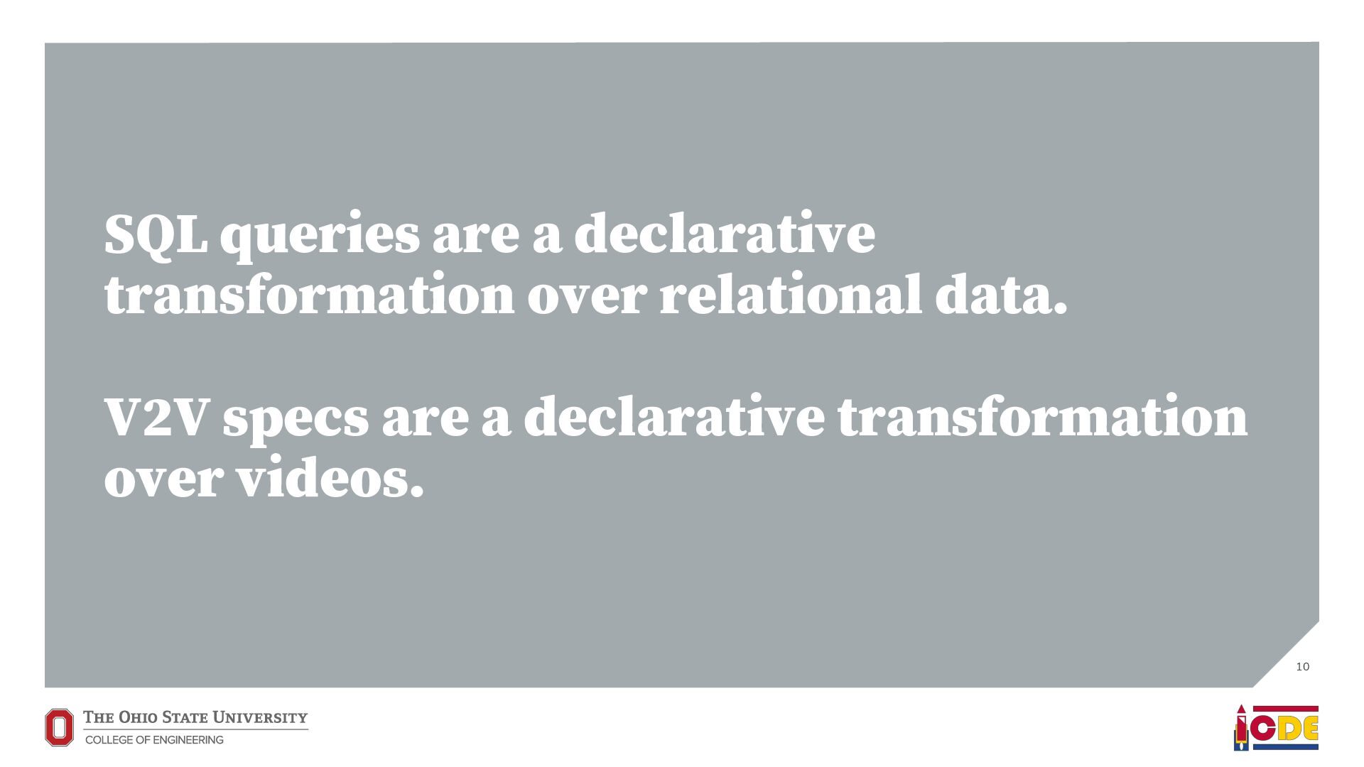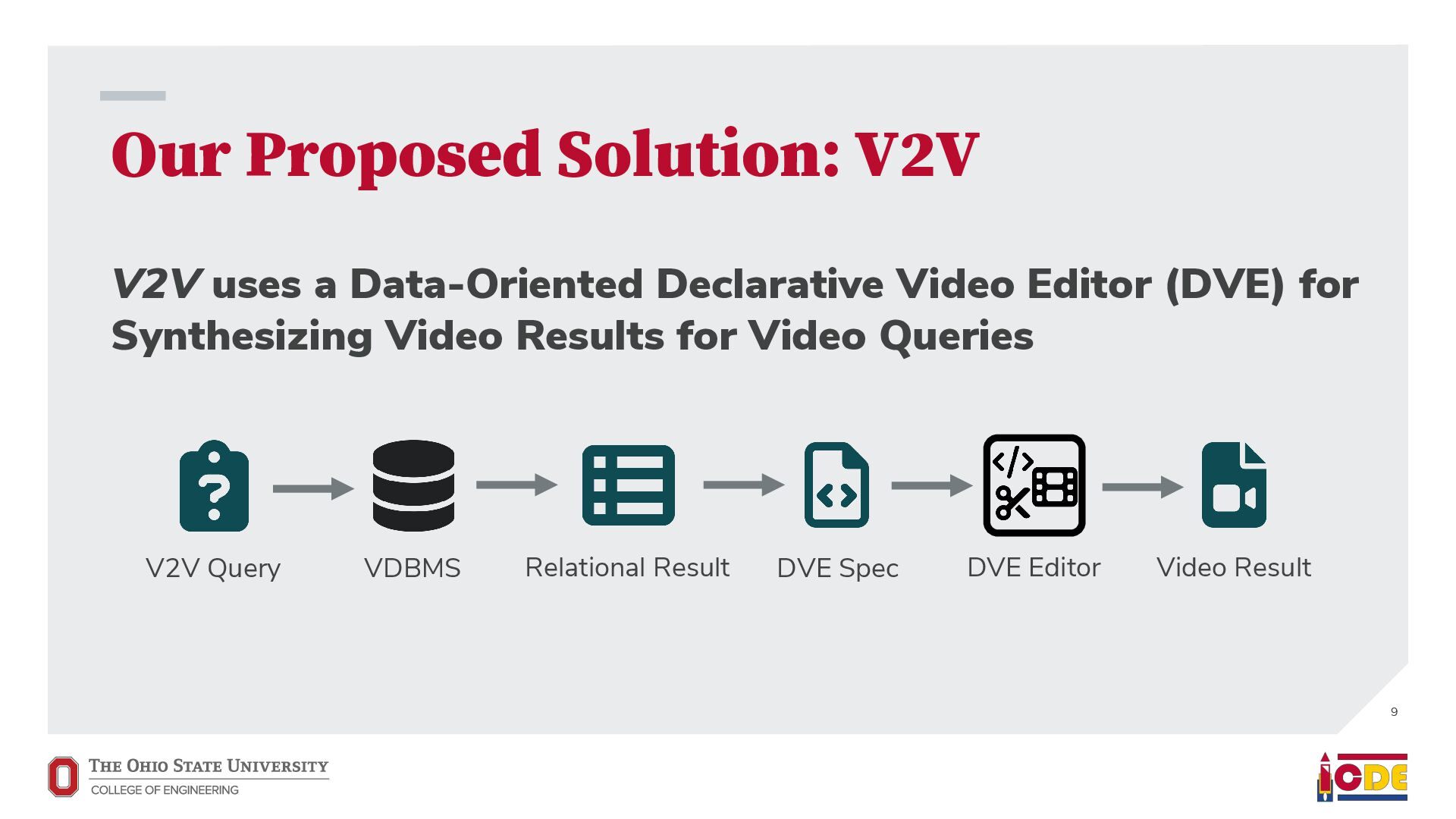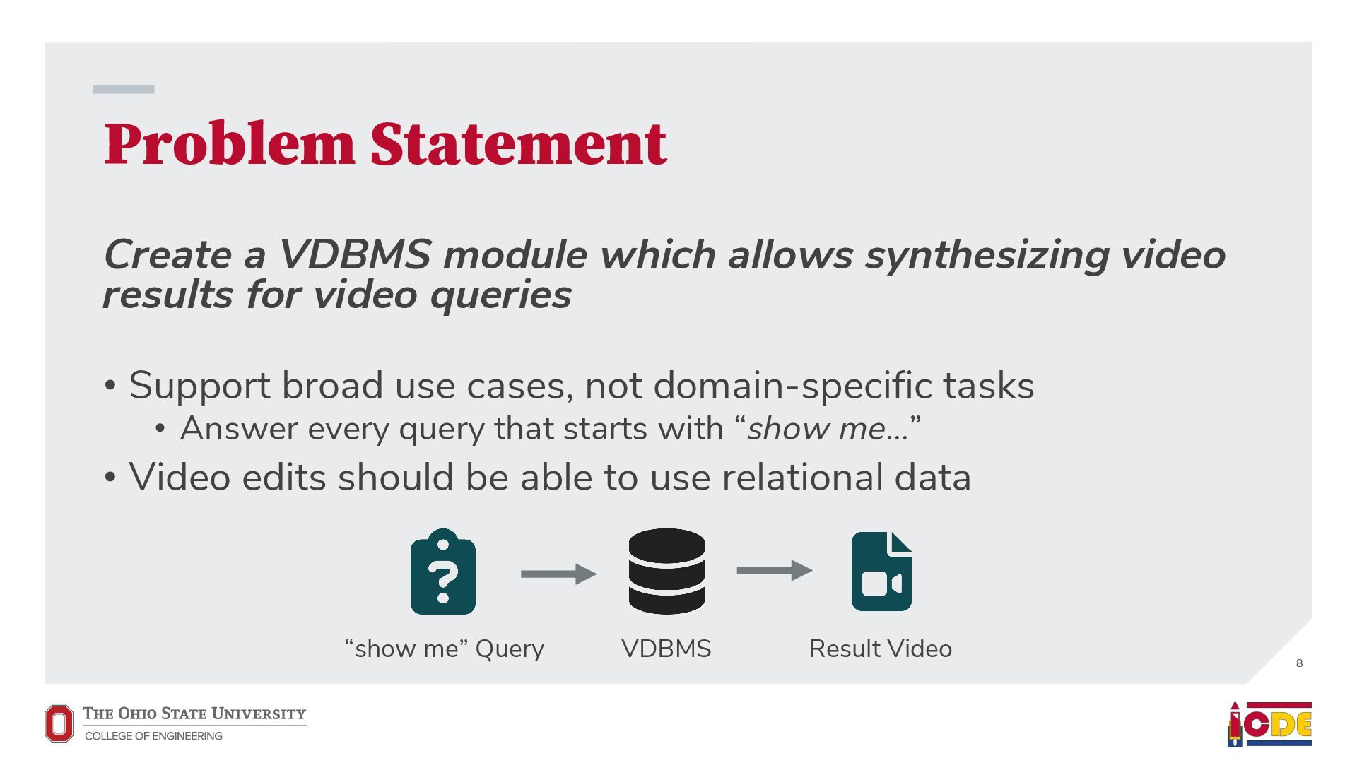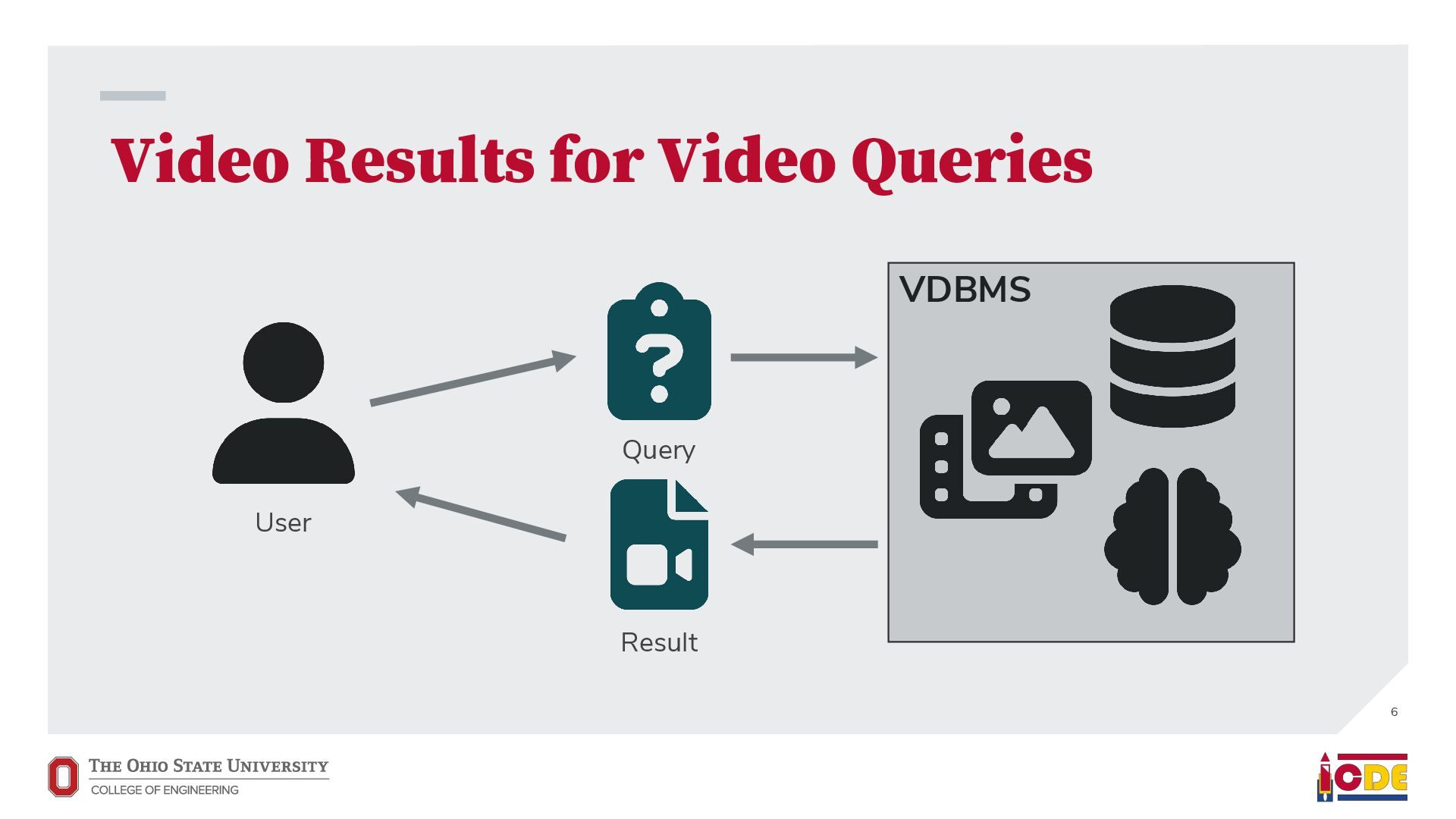 [email protected] University of Washington ABSTRACT Current video database management systems (VDBMSs) fail to support the growing number of video datasets in diverse domains because these systems assume clean data and rely on pretrained models to detect known objects or actions. Existing systems also lack good support for compositional queries that seek events con- sisting of multiple objects with complex spatial and temporal rela- tionships. In this paper, we propose VOCAL, a vision of a VDBMS that supports ecient data cleaning, exploration and organization, and compositional queries, even when no pretrained model exists to extract semantic content. These techniques utilize optimizations to minimize the manual eort required of users. 1 INTRODUCTION In many application domains—ranging from scientic research to urban planning—the use of large video datasets has become com- mon in great part because camera quality continues to improve and storage remains aordable. Video datasets capture content from diverse domains and support widely varying applications, such as using cameras mounted on vehicles to understand how neigh- borhoods evolved through the pandemic [39], using animal-borne cameras to investigate animal (e.g., shark) habitat preferences [28], or using citywide camera networks to measure the eect of traf- c interventions on crowded city streets [55]. In response to the proliferation of video datasets and applications, recent work has pushed the state of the art in the eld of video database manage- ment systems (VDBMSs) [1, 12, 23, 31, 37]. These systems, however, (i) expect clean video data, (ii) require pretrained machine learning models to detect objects or actions, and (iii) have limited or no sup- port for compositional queries about multiple objects interacting over time. ∗Both authors contributed equally to the paper This paper is published under the Creative Commons Attribution 4.0 International (CC-BY 4.0) license. Authors reserve their rights to disseminate the work on their personal and corporate Web sites with the appropriate attribution, provided that you attribute the original work to the authors and CIDR 2022. 12th Annual Conference on Innovative Data Systems Research (CIDR ’22). January 10-13, 2022, Chaminade, USA. Large-scale dirty video dataset Compositional event Find “one deer foraging followed by multiple deer traveling” User-defined query Output video segments with one deer foraging followed by multiple deer traveling VOCAL Interactive video data cleaning Interactive exploration and labeling Compositional query processing … … Foraging Traveling Figure 1: We introduce VOCAL, an end-to-end video analyt- ics system that facilitates cleaning, exploration, and com- positional query processing over large-scale video datasets, even for domains where no pretrained models exist. In contrast, most real world collection eorts violate all three assumptions. They result in videos with dirty data. They often lack domain-specic models to support the target application. Users would like to ask complex, compositional queries on their data. As a motivating example, we are working with a dataset of videos captured by cameras attached to wild deer (Odocoileus spp.) [16]. The videos are to be used to provide insight into deer activity patterns: How much time do deer spend foraging versus lying down? How do environmental conditions (e.g., slope and depth of snow) aect deer activity? The collected data is dirty: camera lenses are often obscured by snow for a large fraction of time (up to 75%), requiring that scientists rst manually clean each video to nd usable fragments. Because egocentric deer video is an uncommon domain, there are no pretrained machine learning models available to detect deer activity directly. Scientists thus need to annotate their videos manually. This is tedious, so scientists have only annotated a small fraction of the data. Finally, scientists would like to understand complex deer behavior that goes beyond simple activity detection. In this paper, we propose VOCAL (Video Organization and Inter- active Compositional AnaLytics), a vision of a VDBMS that supports user-dened applications and compositional queries for any dataset, even when the videos are dirty or lack domain-specic pretrained models (Figure 1). We contribute initial techniques towards devel- oping VOCAL to (i) lter dirty data from videos (Section 2), (ii) EVA Spatialize VIVA VOCAL
