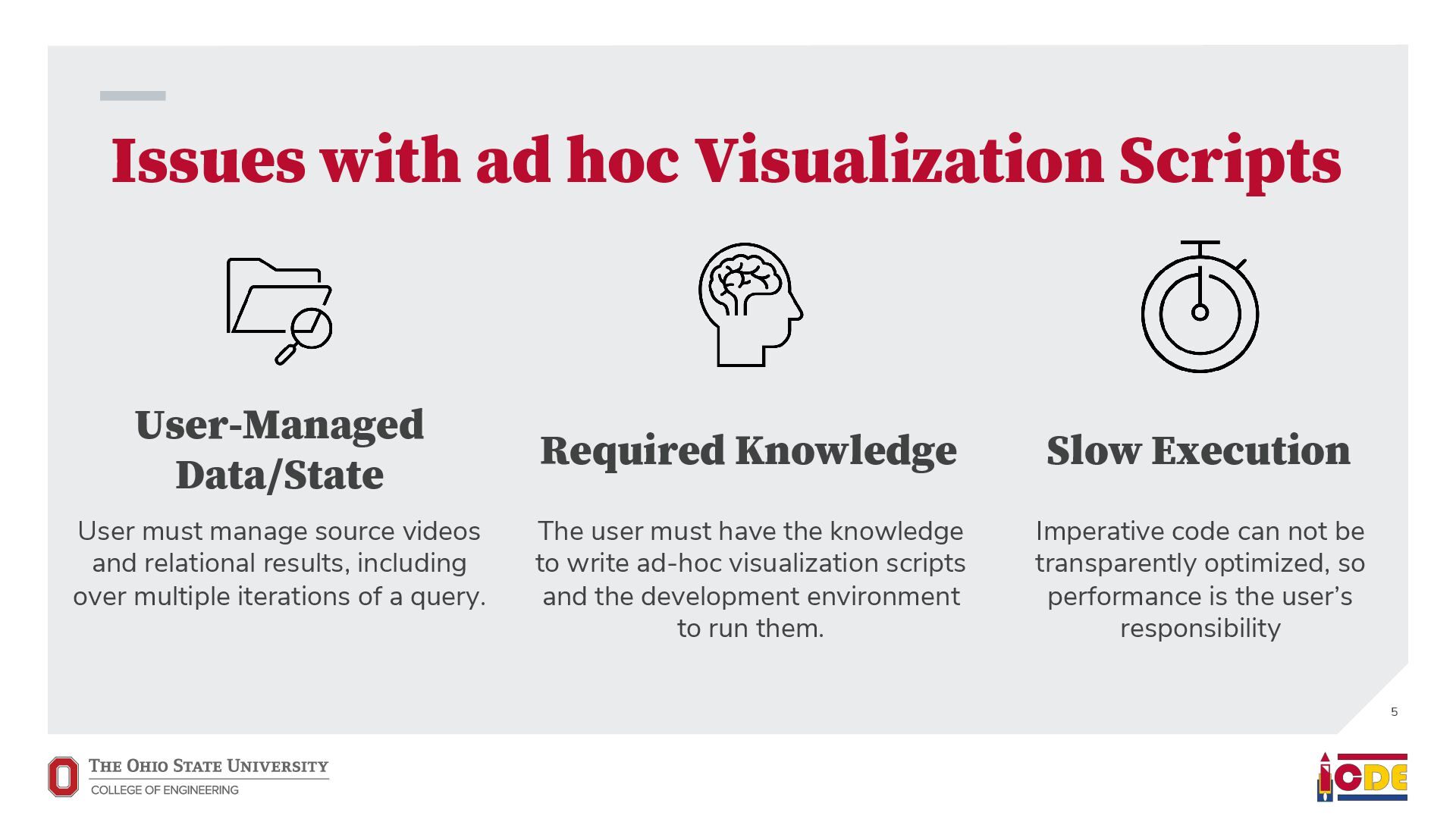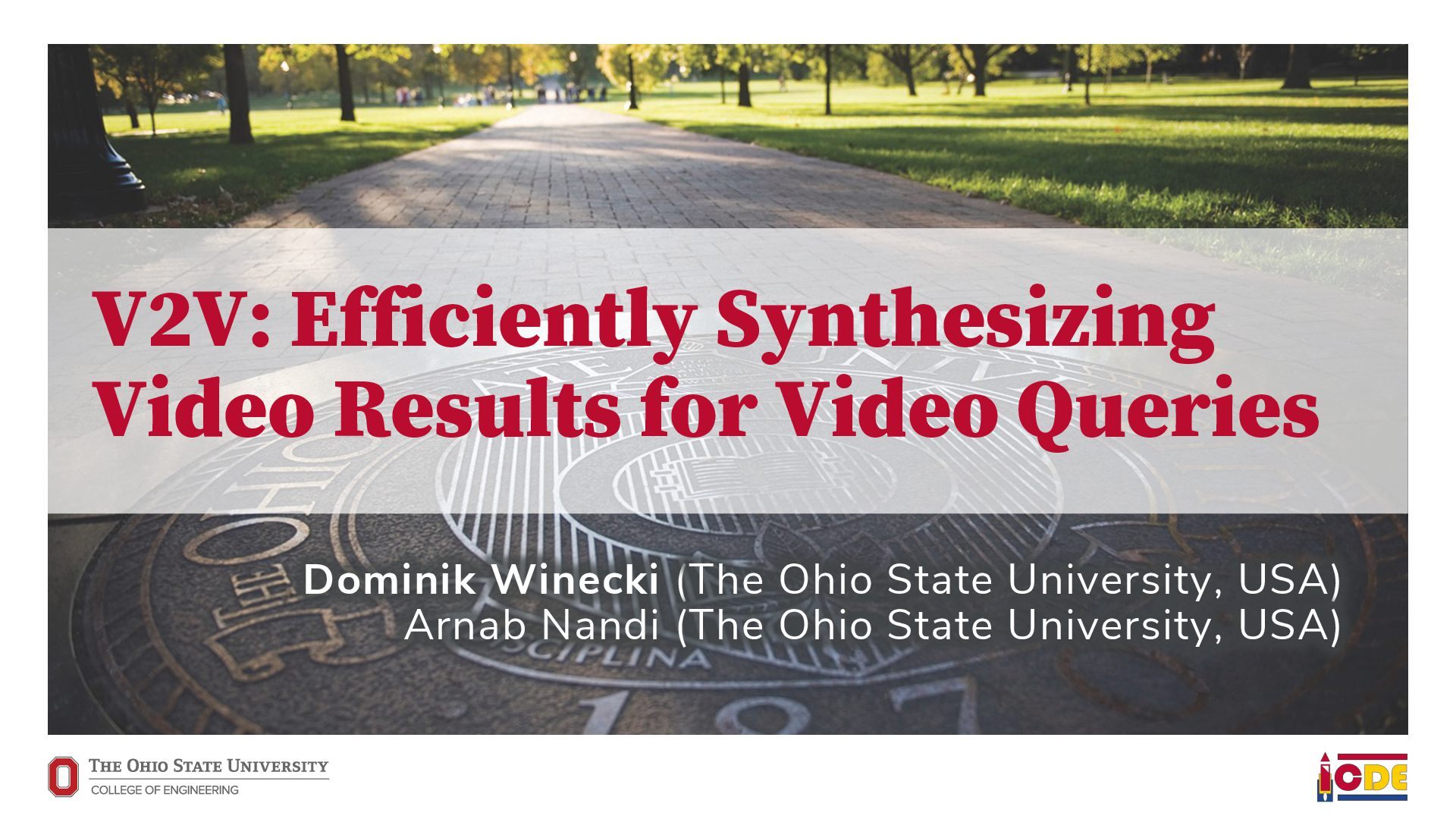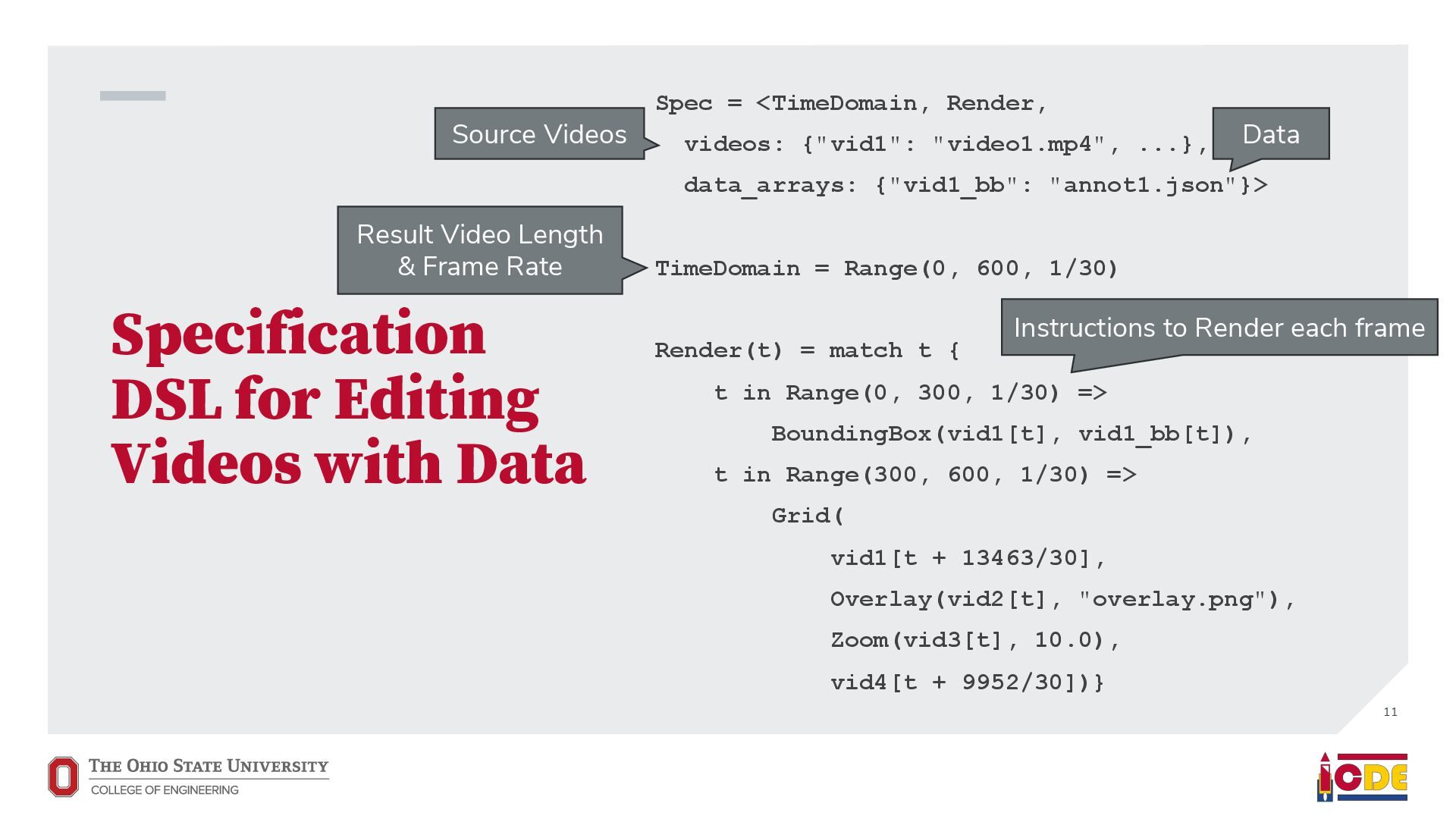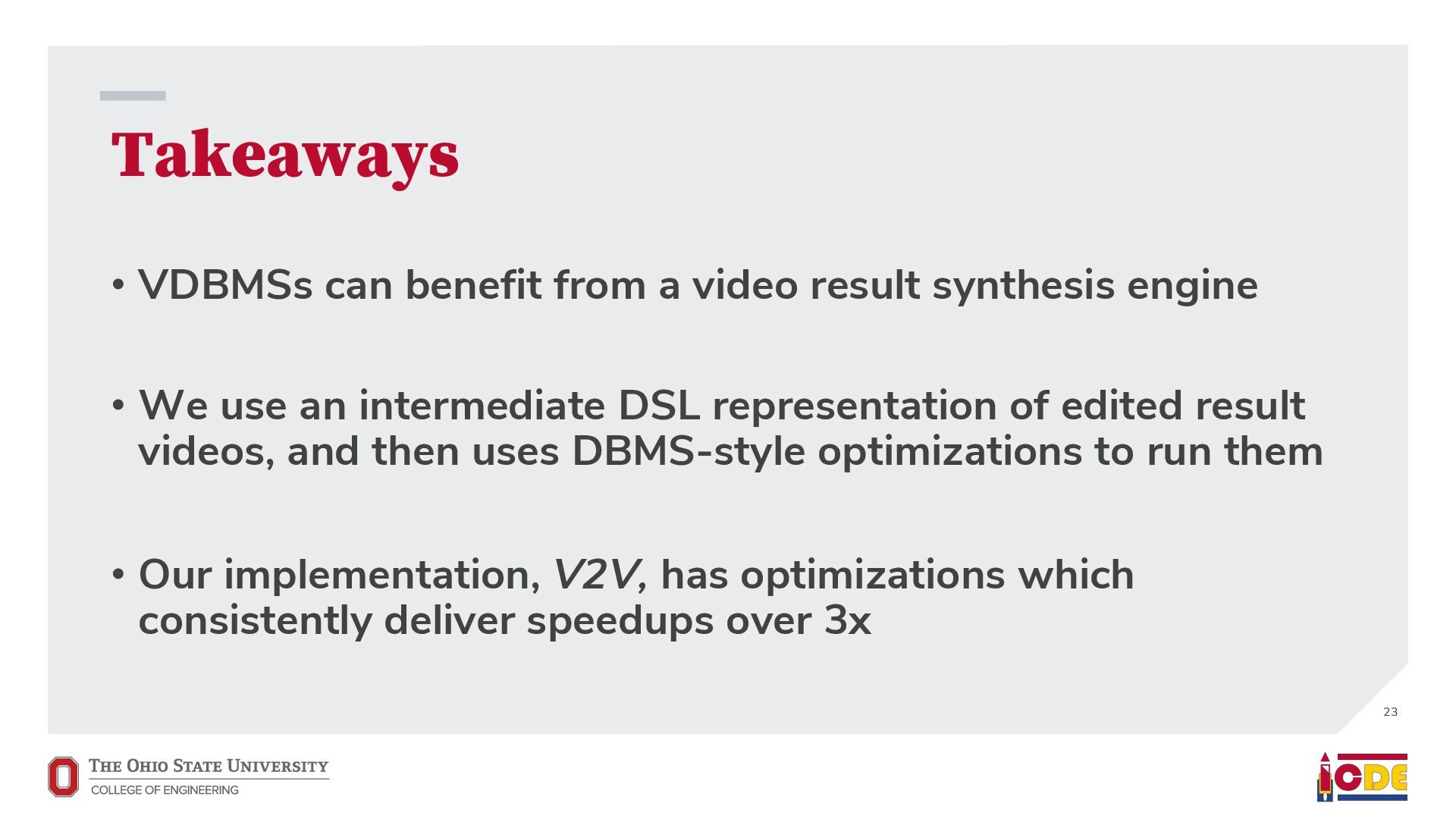 [email protected] University of Washington ABSTRACT Current video database management systems (VDBMSs) fail to support the growing number of video datasets in diverse domains because these systems assume clean data and rely on pretrained models to detect known objects or actions. Existing systems also lack good support for compositional queries that seek events con- sisting of multiple objects with complex spatial and temporal rela- tionships. In this paper, we propose VOCAL, a vision of a VDBMS that supports ecient data cleaning, exploration and organization, and compositional queries, even when no pretrained model exists to extract semantic content. These techniques utilize optimizations to minimize the manual eort required of users. 1 INTRODUCTION In many application domains—ranging from scientic research to urban planning—the use of large video datasets has become com- mon in great part because camera quality continues to improve and storage remains aordable. Video datasets capture content from diverse domains and support widely varying applications, such as using cameras mounted on vehicles to understand how neigh- borhoods evolved through the pandemic [39], using animal-borne cameras to investigate animal (e.g., shark) habitat preferences [28], or using citywide camera networks to measure the eect of traf- c interventions on crowded city streets [55]. In response to the proliferation of video datasets and applications, recent work has pushed the state of the art in the eld of video database manage- ment systems (VDBMSs) [1, 12, 23, 31, 37]. These systems, however, (i) expect clean video data, (ii) require pretrained machine learning models to detect objects or actions, and (iii) have limited or no sup- port for compositional queries about multiple objects interacting over time. ∗Both authors contributed equally to the paper This paper is published under the Creative Commons Attribution 4.0 International (CC-BY 4.0) license. Authors reserve their rights to disseminate the work on their personal and corporate Web sites with the appropriate attribution, provided that you attribute the original work to the authors and CIDR 2022. 12th Annual Conference on Innovative Data Systems Research (CIDR ’22). January 10-13, 2022, Chaminade, USA. Large-scale dirty video dataset Compositional event Find “one deer foraging followed by multiple deer traveling” User-defined query Output video segments with one deer foraging followed by multiple deer traveling VOCAL Interactive video data cleaning Interactive exploration and labeling Compositional query processing … … Foraging Traveling Figure 1: We introduce VOCAL, an end-to-end video analyt- ics system that facilitates cleaning, exploration, and com- positional query processing over large-scale video datasets, even for domains where no pretrained models exist. In contrast, most real world collection eorts violate all three assumptions. They result in videos with dirty data. They often lack domain-specic models to support the target application. Users would like to ask complex, compositional queries on their data. As a motivating example, we are working with a dataset of videos captured by cameras attached to wild deer (Odocoileus spp.) [16]. The videos are to be used to provide insight into deer activity patterns: How much time do deer spend foraging versus lying down? How do environmental conditions (e.g., slope and depth of snow) aect deer activity? The collected data is dirty: camera lenses are often obscured by snow for a large fraction of time (up to 75%), requiring that scientists rst manually clean each video to nd usable fragments. Because egocentric deer video is an uncommon domain, there are no pretrained machine learning models available to detect deer activity directly. Scientists thus need to annotate their videos manually. This is tedious, so scientists have only annotated a small fraction of the data. Finally, scientists would like to understand complex deer behavior that goes beyond simple activity detection. In this paper, we propose VOCAL (Video Organization and Inter- active Compositional AnaLytics), a vision of a VDBMS that supports user-dened applications and compositional queries for any dataset, even when the videos are dirty or lack domain-specic pretrained models (Figure 1). We contribute initial techniques towards devel- oping VOCAL to (i) lter dirty data from videos (Section 2), (ii) EVA Spatialize VIVA VOCAL
