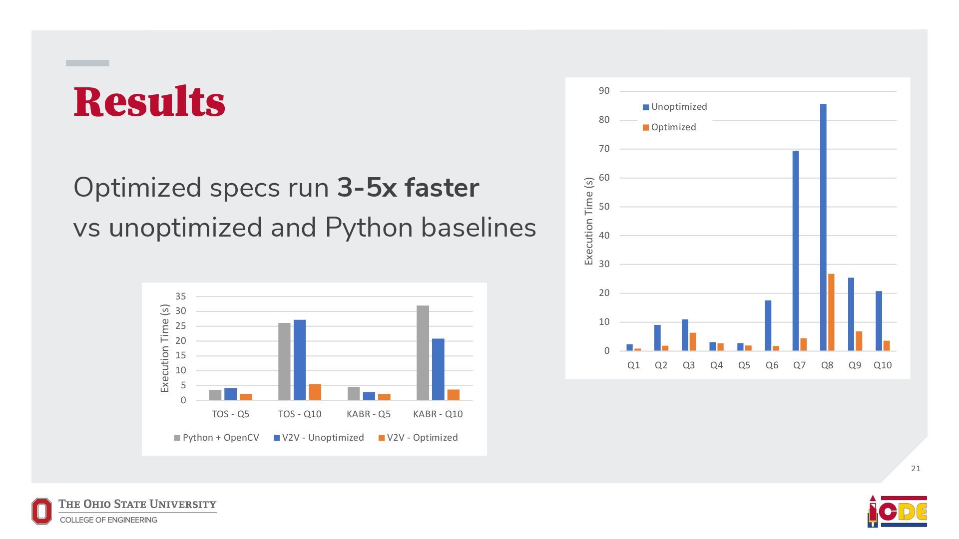 [email protected] ABSTRACT Advances in deep learning have led to a resurgence of interest in video analytics. In an exploratory video analytics pipeline, a data scientist often starts by searching for a global trend and then iteratively renes the query until they identify the desired local trend. These queries tend to have overlapping computation and often dier in their predicates. However, these predicates are com- putationally expensive to evaluate since they contain user-dened functions (UDFs) that wrap around deep learning models. In this paper, we present EVA, a video database management sys- tem (VDBMS) that automatically materializes and reuses the results of expensive UDFs to facilitate faster exploratory data analysis. It diers from the state-of-the-art (SOTA) reuse algorithms in tradi- tional DBMSs in three ways. First, it focuses on reusing the results of UDFs as opposed to those of sub-plans. Second, it takes a symbolic approach to analyze predicates and identify the degree of overlap between queries. Third, it factors reuse into UDF evaluation cost and uses the updated cost function in critical query optimization decisions like predicate reordering and model selection. Our empir- ical analysis of EVA demonstrates that it accelerates exploratory video analytics workloads by 4⇥ with a negligible storage over- head (1.001⇥). We demonstrate that the reuse algorithm in EVA complements the specialized lters adopted in SOTA VDBMSs. CCS CONCEPTS • Computing methodologies ! Image processing; Symbolic and algebraic manipulation; • Information systems ! Query optimization. KEYWORDS Video Analytics, Symbolic Computation, Database Management System ACM Reference Format: Zhuangdi Xu, Gaurav Tarlok Kakkar, Joy Arulraj, and Umakishore Ra- machandran. 2022. EVA: A Symbolic Approach to Accelerating Exploratory ∗Both authors contributed equally to the paper. This work is licensed under a Creative Commons Attribution International 4.0 License. SIGMOD ’22, June 12–17, 2022, Philadelphia, PA, USA © 2022 Copyright held by the owner/author(s). ACM ISBN 978-1-4503-9249-5/22/06. https://doi.org/10.1145/3514221.3526142 Video Analytics with Materialized Views. In Proceedings of the 2022 In- ternational Conference on Management of Data (SIGMOD ’22), June 12–17, 2022, Philadelphia, PA, USA. ACM, New York, NY, USA, 15 pages. https: //doi.org/10.1145/3514221.3526142 1 INTRODUCTION Researchers have presented novel techniques for eciently ana- lyzing visual data at scale in video database management systems (VDBMSs), including sampling, ltering, and specialized neural net- works [35, 36, 44]. However, in exploratory video analytics, queries often exhibit a signicant overlap of computation due to redundant execution of user-dened functions (abbrev., UDFs) associated with computer vision tasks (e.g., object detection). Prior eorts in video analytics have not extensively studied the problem of materializing and reusing the results of expensive UDFs. While there have been eorts in traditional database management systems (DBMSs) to handle expensive UDFs [13, 17, 19, 27, 45, 50], they do not leverage all of the opportunities present in video analytics. M. Consider a law enforcement ocer analyzing a video data set for tracking a suspicious vehicle with the help of a witness. They typically rst search for a global trend and then iter- atively rene the query until they nd the desired local trend [17]. During this query renement process, queries tend to have overlap- ping computation. Initially, the witness may only recall the vehicle model (e.g., SUV) and the approximate time-frame in which they saw the vehicle (e.g., night time). So, the ocer starts with &1 in Listing 1 that searches for all SUVs present during that time-frame to identify the suspicious vehicle. While going over the frames with SUVs returned by &1, the witness might recall the color of the vehi- cle (e.g., red). Then, the ocer narrows down the search space and looks for the license plate of all red-colored SUVs (&2). Lastly, in &3, the ocer searches the entire dataset for the suspicious vehicle using the license plate information. Multiple applications may query over the same video and their queries may also contain overlapping computation. For instance, a trac planner may be interested in analyzing the trac congestion over the entire day using &4. This task only requires a less-accurate (and faster) object detection model. Across these queries, several UDFs are redundantly evaluated (i.e., VM, OD , VC, A, and L) on many frames. We seek to accelerate these queries by materializing and reusing the re- sults of expensive UDFs, since these functions dominate the overall query processing time. Session 8: Query Processing and Data Management for ML SIGMOD ’22, June 12–17, 2022, Philadelphia, PA, USA VIVA: An End-to-End System for Interactive Video Analytics Daniel Kang∗