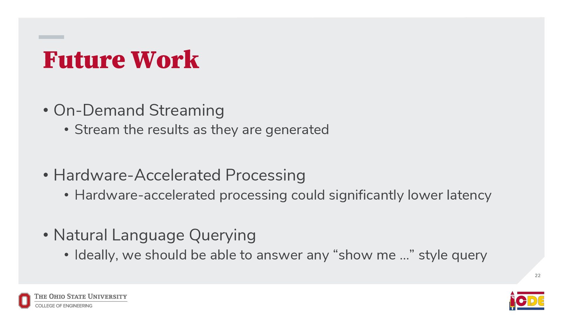 [email protected] Stanford University and Databricks ABSTRACT The growth of video volumes and increased DNN capabilities has led to a growing desire for video analytics. In response, the data analytics community has proposed multiple systems that optimize specic query types (e.g., selection queries) or a particular step in query execution (e.g., video retrieval from storage). However, none of these systems provide end-to-end, practical video analytics for users to iteratively and interactively engage with queries, as is the case with analytics systems for structured data. In response, we are building VIVA: an end-to-end system for interactive video analytics. VIVA contains ve novel components. First, VIVA uses relational hints, which allow users to express rela- tionships between columns that are dicult to automatically infer (e.g., mentions of a person in a transcript can be used as a proxy for the person appearing in the video). Second, VIVA introduces a mixed-data query optimizer that optimizes queries across both structured and unstructured data. Third, VIVA features an embed- ding cache that decides which results/embeddings to store for future queries. Finally, VIVA co-optimizes storage and query execution with its video le manager and accelerator-based execution engine. The former decides how to pre-fetch/manage video, while the latter selects and manages heterogeneous hardware backends spanning the growing number of DNN accelerators. We describe the chal- lenges and design requirements for VIVA’s development and outline ongoing and future work for realizing VIVA. 1 INTRODUCTION Video volumes are growing tremendously in scale: 500 hours of video are uploaded to YouTube every minute [36]. At the same time, deep neural networks (DNNs) have increased in capabilities, e.g., allowing for detection of objects in videos [17]. These two trends have made automatic and meaningful analyses of video increasingly feasible, allowing users to answer queries such as “how many birds of a particular species visit a feeder per day” or “do any cars that passed an intersection match an AMBER alert.” To date, research systems for DNN-based video analytics focus on optimizing a specic query type (e.g., selecting a frame with a specic criteria) or a single step in query execution. They range from reducing query costs via approximations [21], ecient use ∗Denotes equal contribution. This article is published under the Creative Commons Attribution License (http://creativecommons.org/licenses/by/3.0/). 12th Annual Conference on Innovative Data Systems Research (CIDR ’22), January 9–12, 2022, Chaminade, USA. VIVA Structured table Query language Parser Mixed-data optimizer Accelerator-based execution engine Embedding cache Video metadata DNN metadata UI Inputs Relational hint explorer Model (re)-training End-to-end Outputs Query analysis Results Serverless GPU Video file manager Materialized results Model (re)-training service SELECT time_window FROM news_analysis WHERE tapper_angry_sanders = TRUE USING HINT transcript_frame_equals Analysis (lat, cost, acc) Plan 1 1hr, $30, 80% Plan 2 20s, $20, 60% Plan 3 1min, $8, 75% Final query results Video 1 Video 2 Serverless *PU Video file manager Figure 1: VIVA’s architecture diagram. Blue components/interfaces are typically found in analytic systems for structured data that re- quire rethinking. Orange components/interfaces are novel to VIVA. of hardware [26], indexing video data [24], to video query pro- gramming models [13]. However, users must manually decide how to combine and manage these systems to answer desired queries. Consider an analyst studying political news coverage from the “big three” cable news channels [19]. The analyst may issue several ad-hoc (i.e., exploratory) queries to understand the dataset, such as nding instances of Bernie Sanders (a politician) reacting angrily to Jake Tapper (a TV news host). To answer this query eciently, the analyst needs to consider several choices, such as: should they train a specialized proxy model for Jake Tapper, Bernie Sanders, or both (e.g., using NS [22])? Is it best to lter for Bernie Sanders and Jake Tapper using the video transcripts rst before searching frames [13]? Have enough labels (e.g., angry face detections) been materialized to leverage a video event specication system [13]? Today, end-to-end systems for terabyte-scale structured data analytics (e.g., data warehouses) alleviate the burden on users from having to manually optimize queries over structured data. These systems eciently automate query planning because structured 1 Spatialyze: A Geospatial Video Analytics System with Spatial-Aware Optimizations Chanwut Kittivorawong*, Yongming Ge*, Yousef Helal, Alvin Cheung University of California, Berkeley ABSTRACT Videos that are shot using commodity hardware such as phones and surveillance cameras record various metadata such as time and location. We encounter such geospatial videos on a daily basis and such videos have been growing in volume signicantly. Yet, we do not have data management systems that allow users to interact with such data eectively. In this paper, we describe Spatialyze, a new framework for end- to-end querying of geospatial videos. Spatialyze comes with a domain-specic language where users can construct geospatial video analytic workows using a 3-step, declarative, build-lter- observe paradigm. Internally, Spatialyze leverages the declarative nature of such workows, the temporal-spatial metadata stored with videos, and physical behavior of real-world objects to optimize the execution of workows. Our results using real-world videos and workows show that Spatialyze can reduce execution time by up to 5.3⇥, while maintaining up to 97.1% accuracy compared to unoptimized execution. 1 INTRODUCTION Geospatial videos are videos in which the location and time that they are shot are known. From surveillance footage, autonomous vehicle (AV) cameras to police body cameras