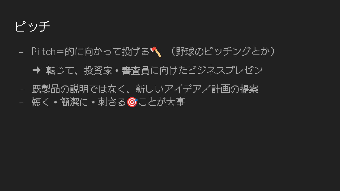 ピッチ - Pitch=的に向かって投げる🪓 (野球のピッチングとか) ➡ 転じて、投資家・審査員に向けたビジネスプレゼン - 既製品の説明ではなく、新しいアイデア/計画の提案 - 短く・簡潔に・刺さる🎯ことが⼤事