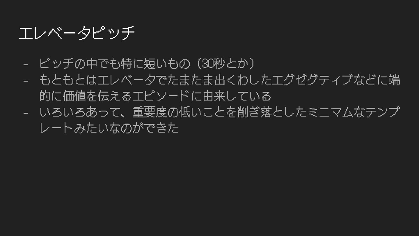 エレベータピッチ - ピッチの中でも特に短いもの(30秒とか) - もともとはエレベータでたまたま出くわしたエグゼグティブなどに端 的に価値を伝えるエピソードに由来している - いろいろあって、重要度の低いことを削ぎ落としたミニマムなテンプ レートみたいなのができた