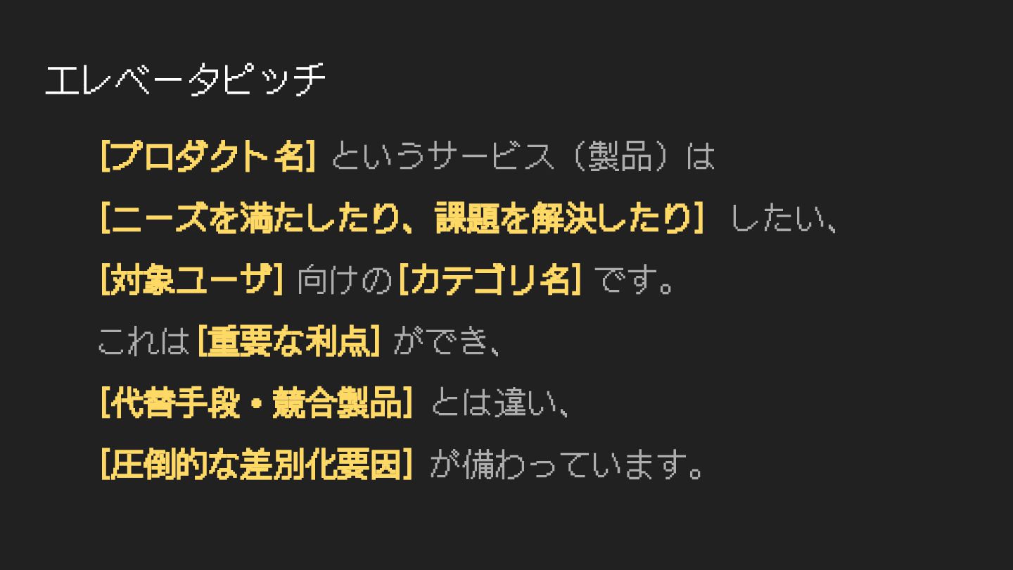 エレベータピッチ [プロダクト名] というサービス(製品)は [ニーズを満たしたり、課題を解決したり] したい、 [対象ユーザ] 向けの[カテゴリ名] です。 これは[重要な利点] ができ、