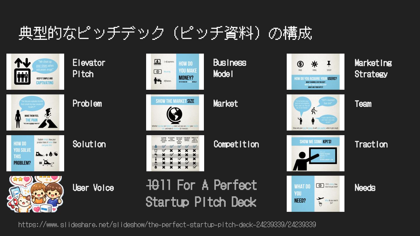 典型的なピッチデック(ピッチ資料)の構成 https://www.slideshare.net/slideshow/the-perfect-startup-pitch-deck-24239339/24239339 Elevator Pitch Problem Solution User Voice Market Business