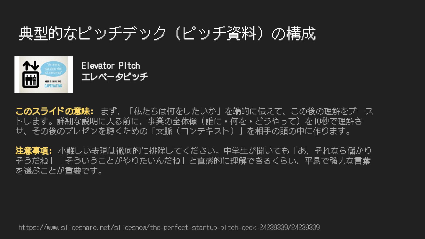 典型的なピッチデック(ピッチ資料)の構成 https://www.slideshare.net/slideshow/the-perfect-startup-pitch-deck-24239339/24239339 このスライドの意味: まず、「私たちは何をしたいか」を端的に伝えて、この後の理解をブース トします。詳細な説明に⼊る前に、事業の全体像(誰に・何を・どうやって)を10秒で理解さ せ、その後のプレゼンを聴くための「⽂脈(コンテキスト)」を相⼿の頭の中に作ります。 注意事項: ⼩難しい表現は徹底的に排除してください。中学⽣が聞いても「あ、それなら儲かり そうだね」「そういうことがやりたいんだね」と直感的に理解できるくらい、平易で強⼒な⾔葉 を選ぶことが重要です。