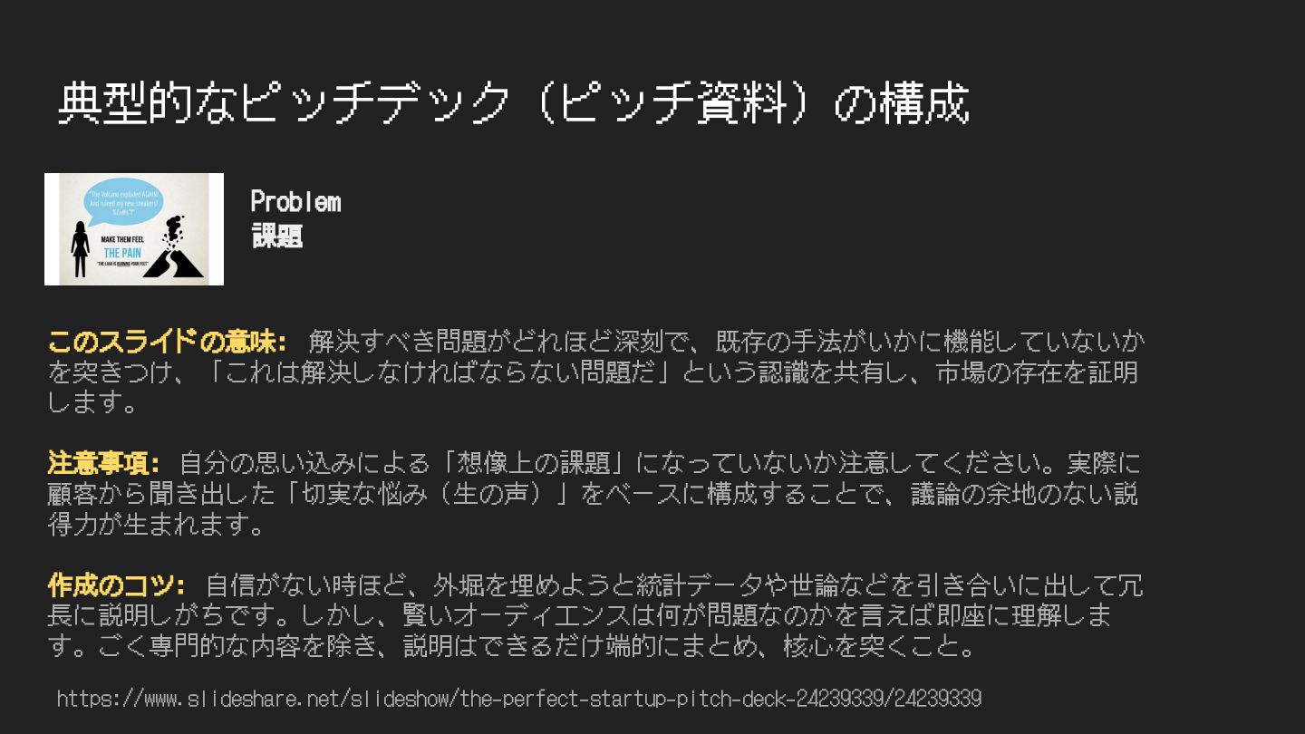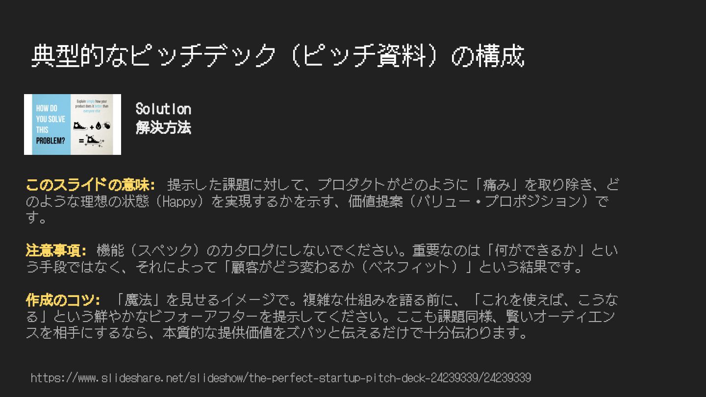 典型的なピッチデック(ピッチ資料)の構成 https://www.slideshare.net/slideshow/the-perfect-startup-pitch-deck-24239339/24239339 このスライドの意味: 解決すべき問題がどれほど深刻で、既存の⼿法がいかに機能していないか を突きつけ、「これは解決しなければならない問題だ」という認識を共有し、市場の存在を証明 します。 注意事項: ⾃分の思い込みによる「想像上の課題」になっていないか注意してください。実際に 顧客から聞き出した「切実な悩み(⽣の声)」をベースに構成することで、議論の余地のない説 得⼒が⽣まれます。