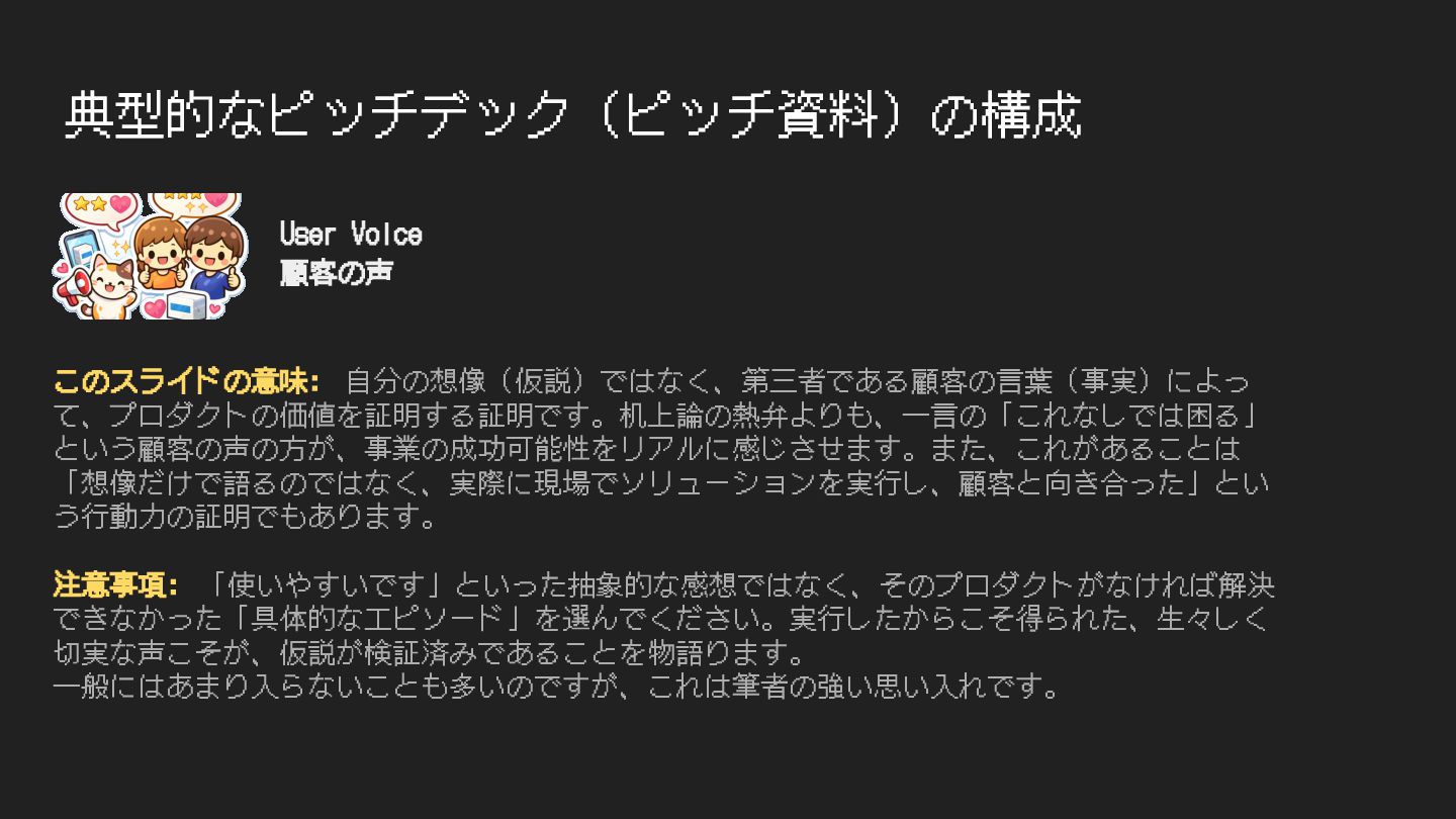 典型的なピッチデック(ピッチ資料)の構成 このスライドの意味: ⾃分の想像(仮説)ではなく、第三者である顧客の⾔葉(事実)によっ て、プロダクトの価値を証明する証明です。机上論の熱弁よりも、⼀⾔の「これなしでは困る」 という顧客の声の⽅が、事業の成功可能性をリアルに感じさせます。また、これがあることは 「想像だけで語るのではなく、実際に現場でソリューションを実⾏し、顧客と向き合った」とい う⾏動⼒の証明でもあります。 注意事項: 「使いやすいです」といった抽象的な感想ではなく、そのプロダクトがなければ解決 できなかった「具体的なエピソード」を選んでください。実⾏したからこそ得られた、⽣々しく