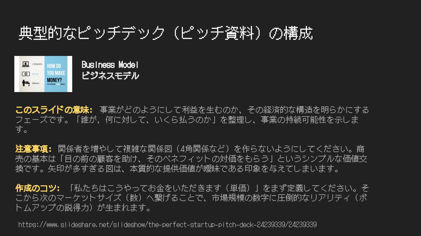 典型的なピッチデック(ピッチ資料)の構成 https://www.slideshare.net/slideshow/the-perfect-startup-pitch-deck-24239339/24239339 このスライドの意味: 事業がどのようにして利益を⽣むのか、その経済的な構造を明らかにする フェーズです。「誰が、何に対して、いくら払うのか」を整理し、事業の持続可能性を⽰しま す。 注意事項: 関係者を増やして複雑な関係図(4⾓関係など)を作らないようにしてください。商 売の基本は「⽬の前の顧客を助け、そのベネフィットの対価をもらう」というシンプルな価値交 換です。⽮印が多すぎる図は、本質的な提供価値が曖昧である印象を与えてしまいます。