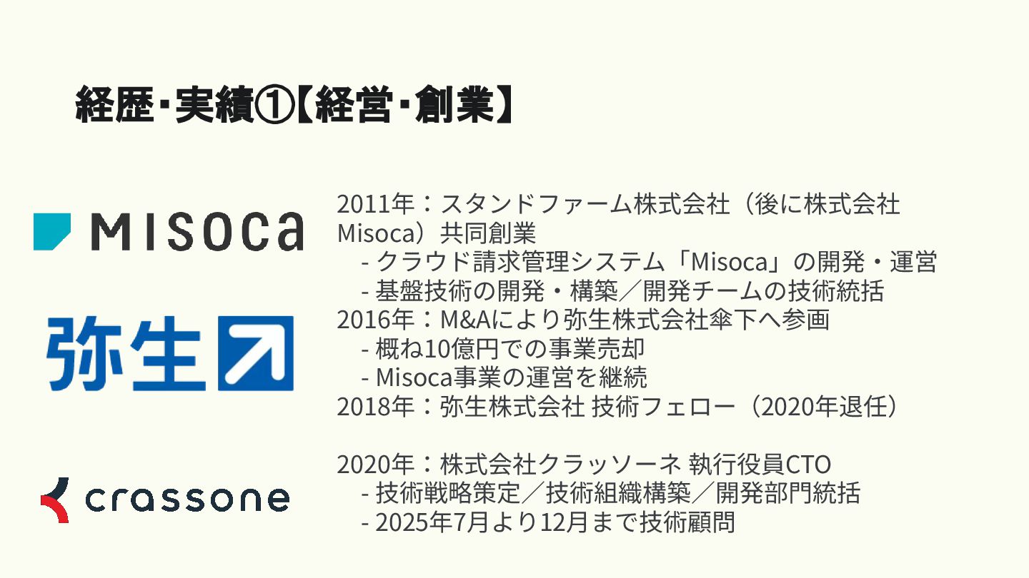 Misoca事業の運営を継続 2018年:弥⽣株式会社 技術フェロー(2020年退任) 2020年:株式会社クラッソーネ 執⾏役員CTO - 技術戦略策定∕技術組織構築∕開発部⾨統括 - 2025年7⽉より12⽉まで技術顧問 経歴・実績①【経営・創業】