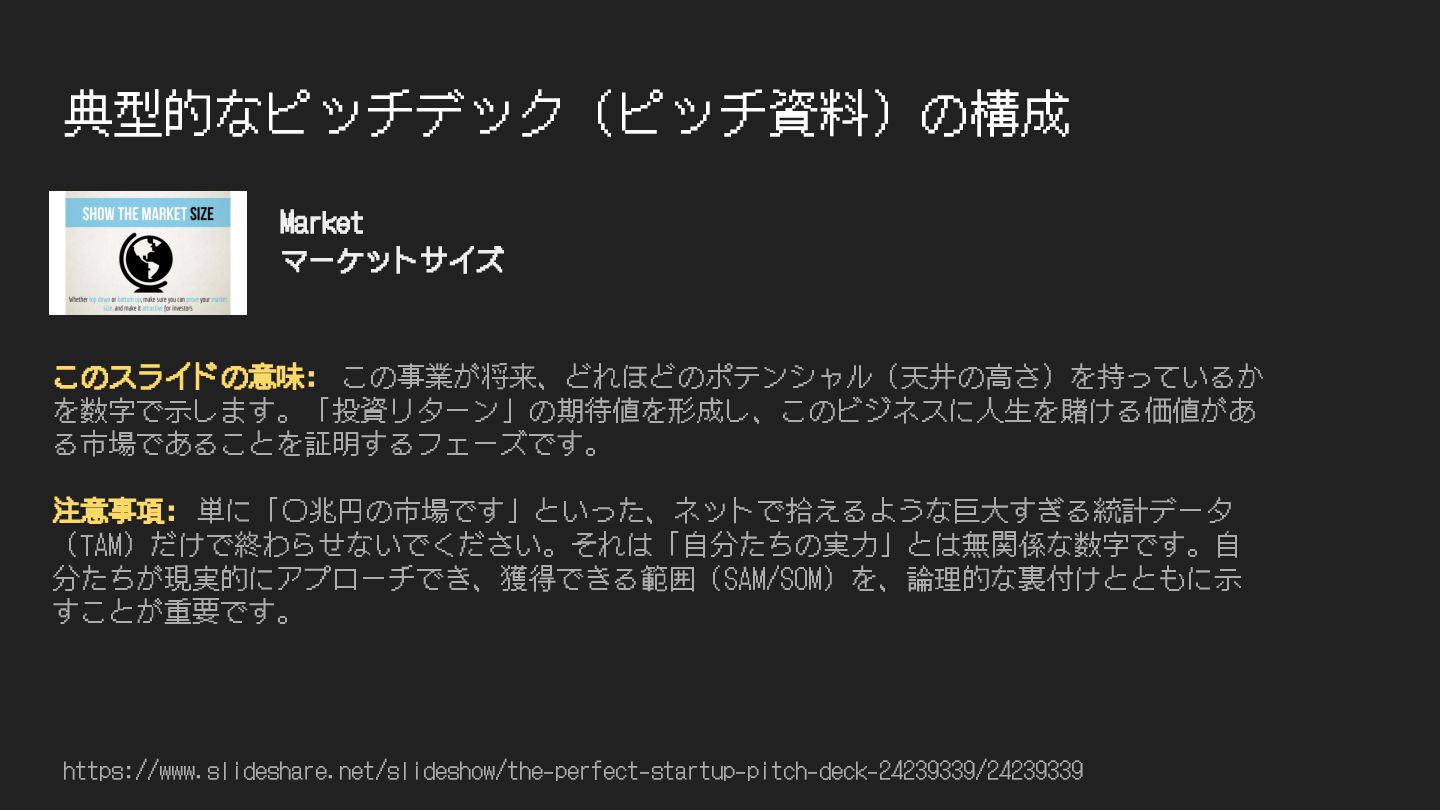 典型的なピッチデック(ピッチ資料)の構成 https://www.slideshare.net/slideshow/the-perfect-startup-pitch-deck-24239339/24239339 このスライドの意味: この事業が将来、どれほどのポテンシャル(天井の⾼さ)を持っているか を数字で⽰します。「投資リターン」の期待値を形成し、このビジネスに⼈⽣を賭ける価値があ る市場であることを証明するフェーズです。 注意事項: 単に「〇兆円の市場です」といった、ネットで拾えるような巨⼤すぎる統計データ (TAM)だけで終わらせないでください。それは「⾃分たちの実⼒」とは無関係な数字です。⾃ 分たちが現実的にアプローチでき、獲得できる範囲(SAM/SOM)を、論理的な裏付けとともに⽰