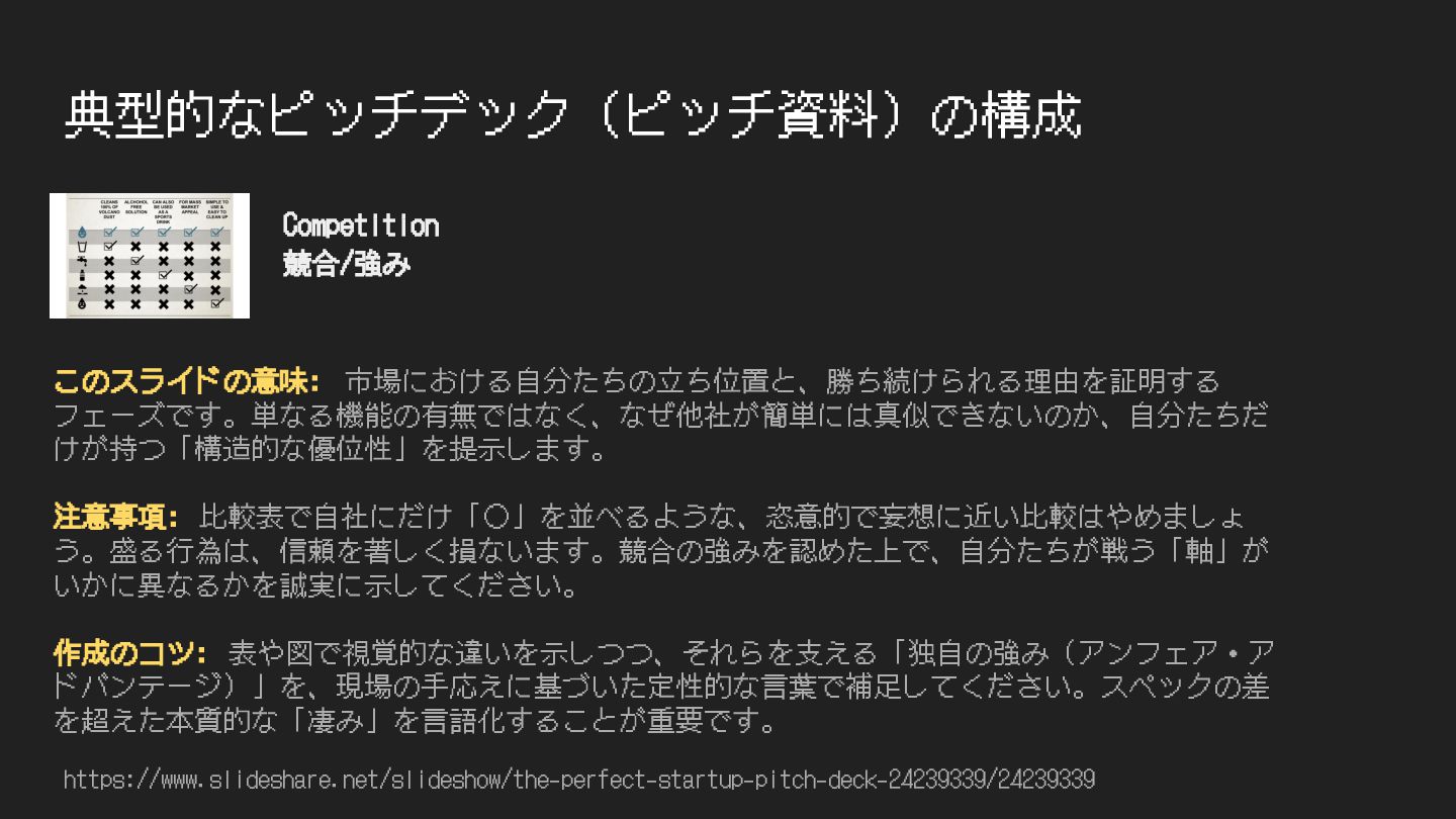 典型的なピッチデック(ピッチ資料)の構成 https://www.slideshare.net/slideshow/the-perfect-startup-pitch-deck-24239339/24239339 このスライドの意味: 市場における⾃分たちの⽴ち位置と、勝ち続けられる理由を証明する フェーズです。単なる機能の有無ではなく、なぜ他社が簡単には真似できないのか、⾃分たちだ けが持つ「構造的な優位性」を提⽰します。 注意事項: ⽐較表で⾃社にだけ「◦」を並べるような、恣意的で妄想に近い⽐較はやめましょ う。盛る⾏為は、信頼を著しく損ないます。競合の強みを認めた上で、⾃分たちが戦う「軸」が いかに異なるかを誠実に⽰してください。
