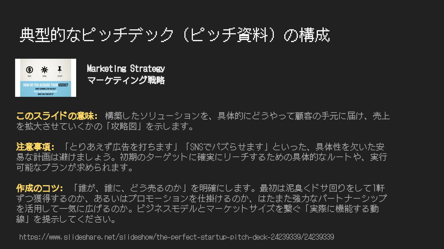 典型的なピッチデック(ピッチ資料)の構成 https://www.slideshare.net/slideshow/the-perfect-startup-pitch-deck-24239339/24239339 このスライドの意味: 構築したソリューションを、具体的にどうやって顧客の⼿元に届け、売上 を拡⼤させていくかの「攻略図」を⽰します。 注意事項: 「とりあえず広告を打ちます」「SNSでバズらせます」といった、具体性を⽋いた安 易な計画は避けましょう。初期のターゲットに確実にリーチするための具体的なルートや、実⾏ 可能なプランが求められます。 作成のコツ:
