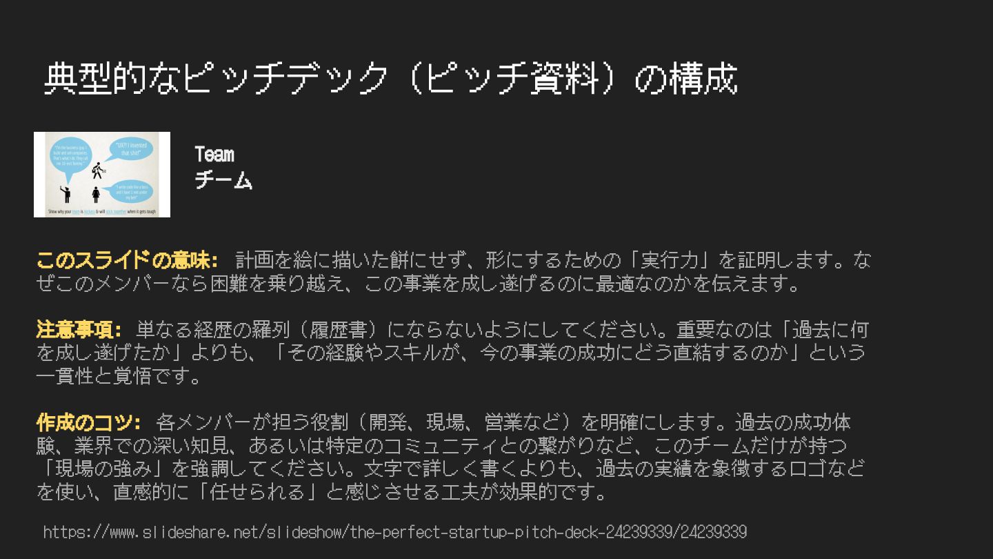 典型的なピッチデック(ピッチ資料)の構成 https://www.slideshare.net/slideshow/the-perfect-startup-pitch-deck-24239339/24239339 このスライドの意味: 計画を絵に描いた餅にせず、形にするための「実⾏⼒」を証明します。な ぜこのメンバーなら困難を乗り越え、この事業を成し遂げるのに最適なのかを伝えます。 注意事項: 単なる経歴の羅列(履歴書)にならないようにしてください。重要なのは「過去に何 を成し遂げたか」よりも、「その経験やスキルが、今の事業の成功にどう直結するのか」という ⼀貫性と覚悟です。 作成のコツ: