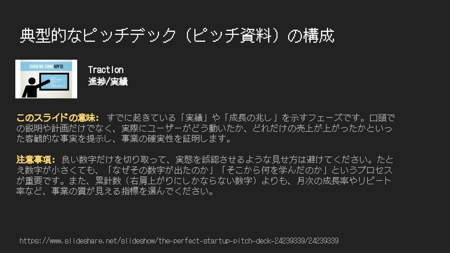 典型的なピッチデック(ピッチ資料)の構成 https://www.slideshare.net/slideshow/the-perfect-startup-pitch-deck-24239339/24239339 このスライドの意味: すでに起きている「実績」や「成⻑の兆し」を⽰すフェーズです。⼝頭で の説明や計画だけでなく、実際にユーザーがどう動いたか、どれだけの売上が上がったかといっ た客観的な事実を提⽰し、事業の確実性を証明します。 注意事項: 良い数字だけを切り取って、実態を誤認させるような⾒せ⽅は避けてください。たと え数字が⼩さくても、「なぜその数字が出たのか」「そこから何を学んだのか」というプロセス が重要です。また、累計数(右肩上がりにしかならない数字)よりも、⽉次の成⻑率やリピート