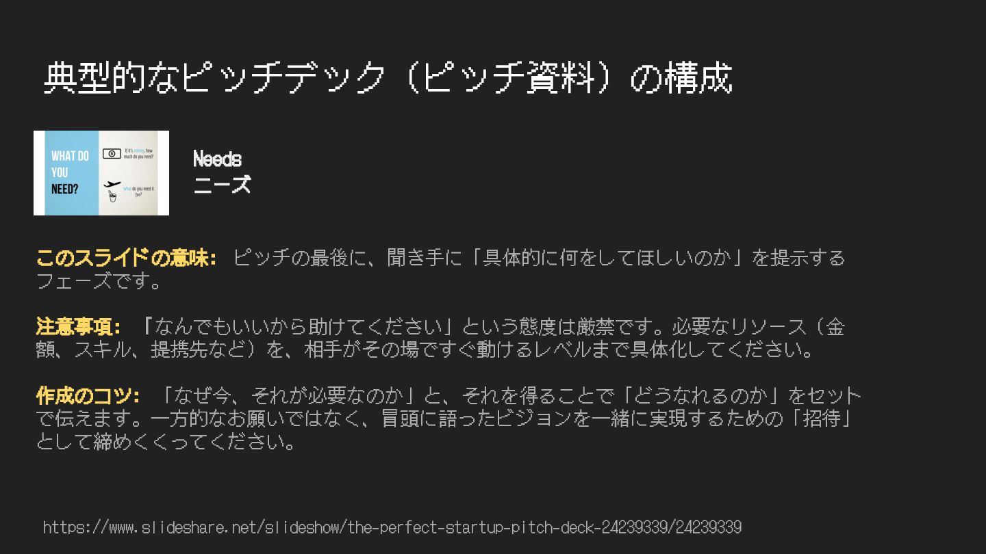 典型的なピッチデック(ピッチ資料)の構成 https://www.slideshare.net/slideshow/the-perfect-startup-pitch-deck-24239339/24239339 このスライドの意味: ピッチの最後に、聞き⼿に「具体的に何をしてほしいのか」を提⽰する フェーズです。 注意事項: 「なんでもいいから助けてください」という態度は厳禁です。必要なリソース(⾦ 額、スキル、提携先など)を、相⼿がその場ですぐ動けるレベルまで具体化してください。 作成のコツ: 「なぜ今、それが必要なのか」と、それを得ることで「どうなれるのか」をセット