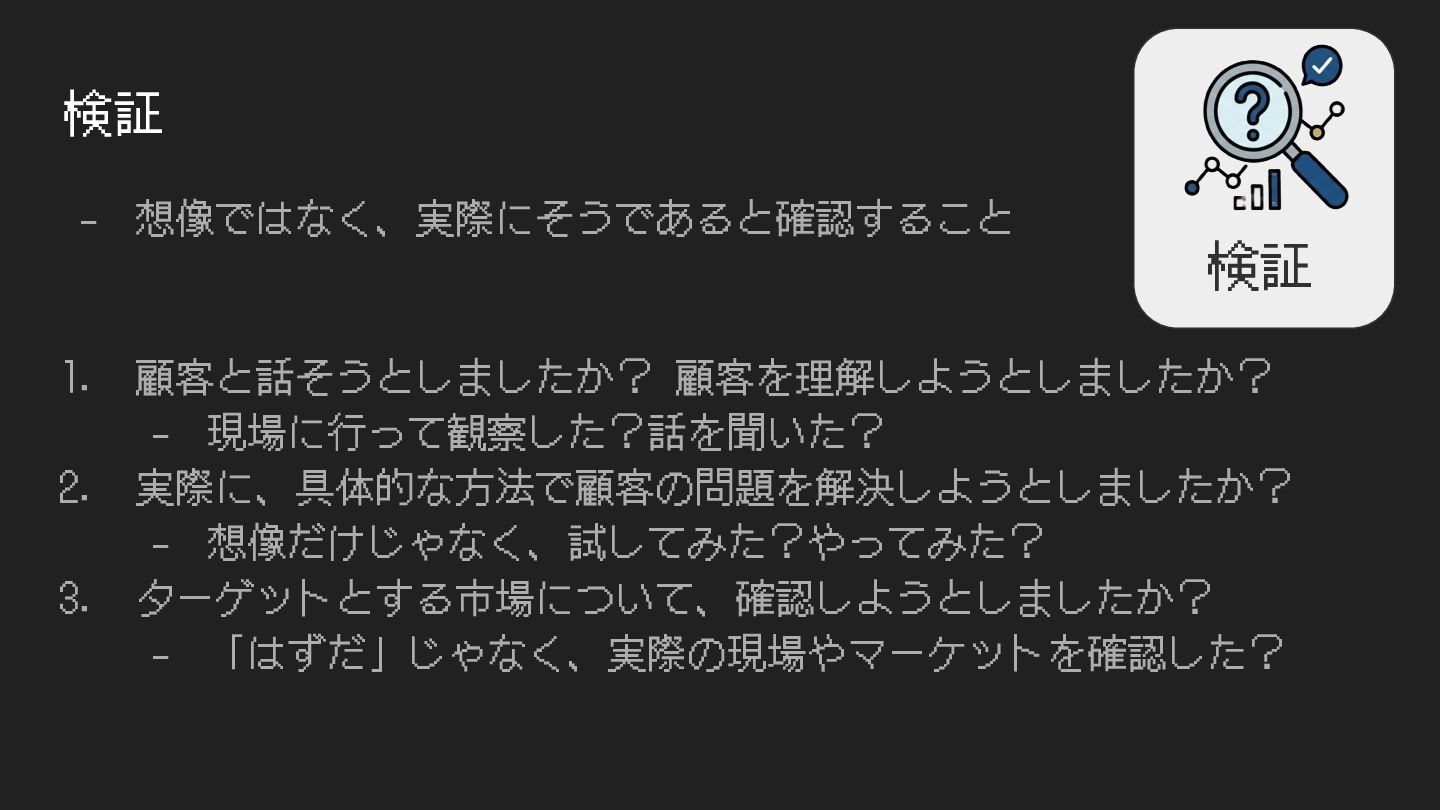 検証 - 想像ではなく、実際にそうであると確認すること 1. 顧客と話そうとしましたか? 顧客を理解しようとしましたか? - 現場に⾏って観察した?話を聞いた? 2. 実際に、具体的な⽅法で顧客の問題を解決しようとしましたか?