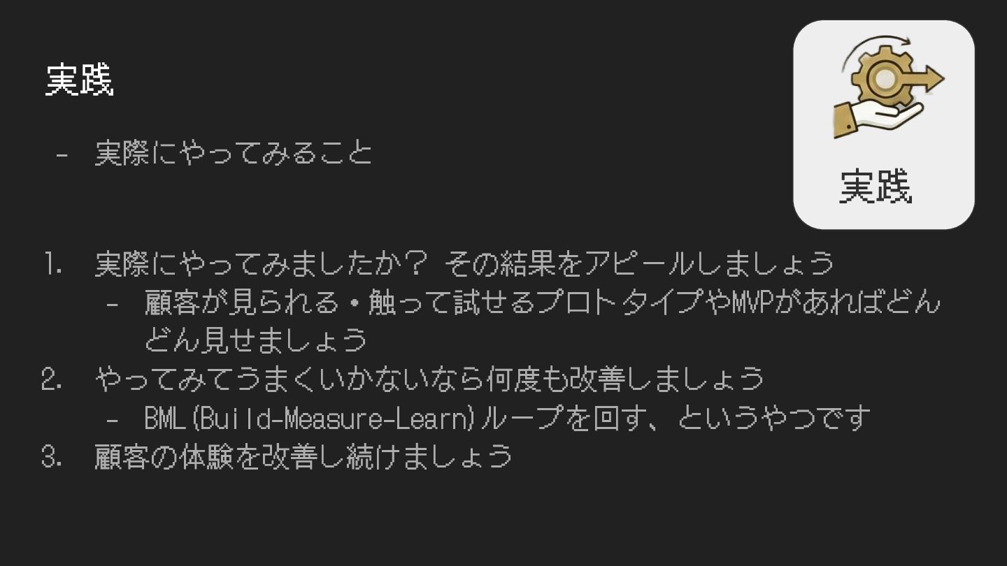 - 実際にやってみること 1. 実際にやってみましたか? その結果をアピールしましょう - 顧客が⾒られる・触って試せるプロトタイプやMVPがあればどん どん⾒せましょう 2. やってみてうまくいかないなら何度も改善しましょう