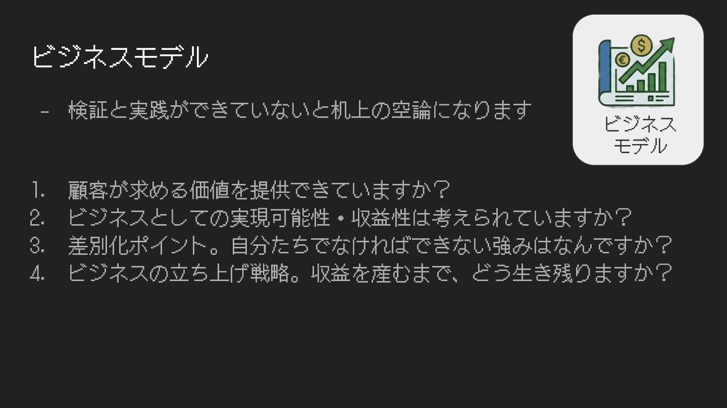 ビジネスモデル - 検証と実践ができていないと机上の空論になります 1. 顧客が求める価値を提供できていますか? 2. ビジネスとしての実現可能性・収益性は考えられていますか? 3. 差別化ポイント。⾃分たちでなければできない強みはなんですか? 4.