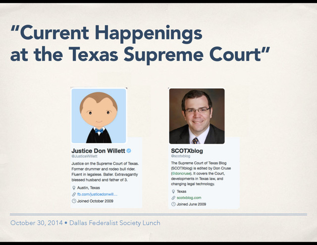 SCOTX Justice–1.26.14 ✓ New Court caboose: Justice Jeff Brown ✓ 4 Justices on the ballot: NLH, PJ, JSB, JVB ✓ New Court legal staff ✓ 2015 Legislature ✓ Rules ✓ Tweaking law clerk start dates