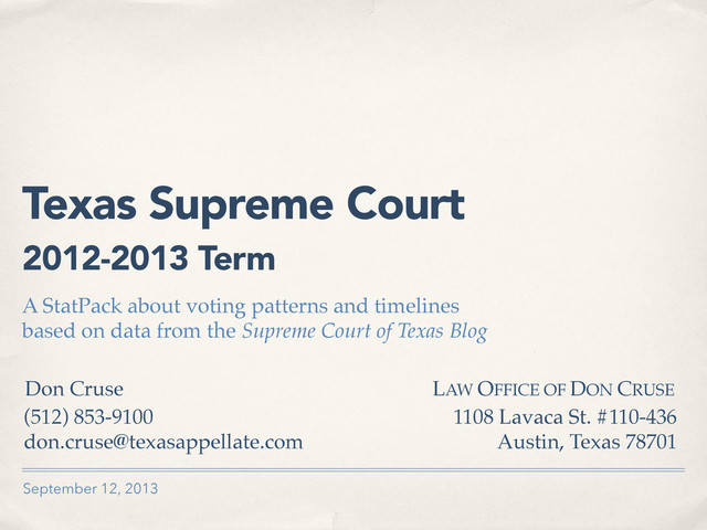 about voting patterns and timelines based on data from the Supreme Court of Texas Blog LAW OFFICE OF DON CRUSE 1108 Lavaca St. #110-436 (512) 853-9100 [email protected] Don Cruse Austin, Texas 78701