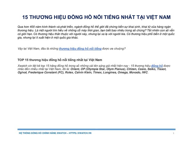 Xwatch xin liệt kê top 15 hãng đồng hồ trong số những cái tên sáng giá nhất hiện nay - 15 thương hiệu đồng hồ được nhắc đến nhiều nhất tại Việt Nam, đó là: Orient, OP (Olympia Star, Olym Pianus), Citizen, Casio, Seiko, Tissot, Ogival, Frederique Constant (FC), Rolex, Calvin Klein, Timex, Longines, Omega, Movado, IWC.
